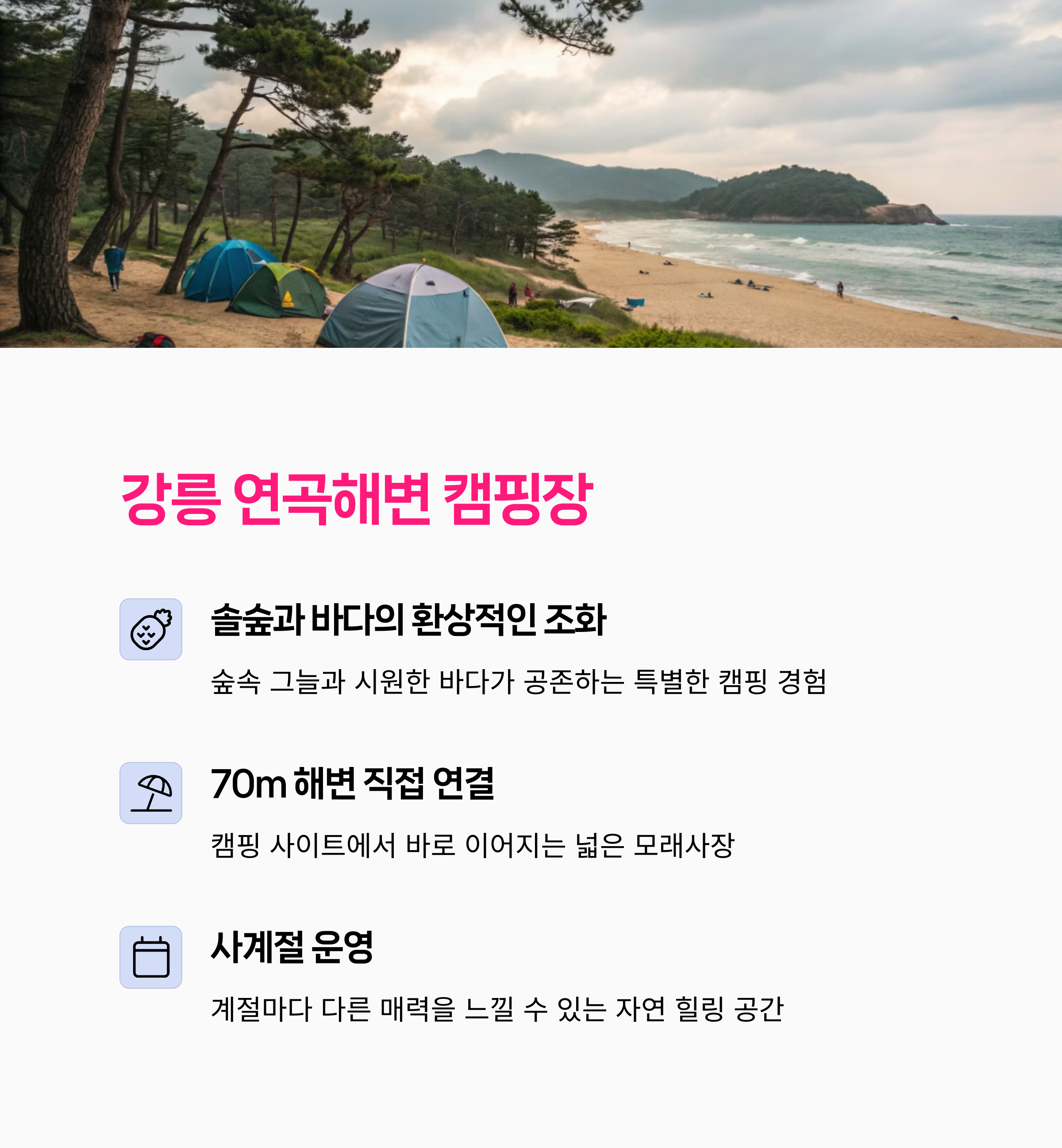 이번 글에서는 동해안의 대표적인 캠핑장들을 소개하며, 왜 이곳들이 가족 단위 여행객에게 ‘강추’인지, 실제 정보와 감성을 담아 풀어보겠다. 한국 속담 “가는 날이 장날”처럼, 이 캠핑장들은 언제 가도 후회 없는 명소들이다!