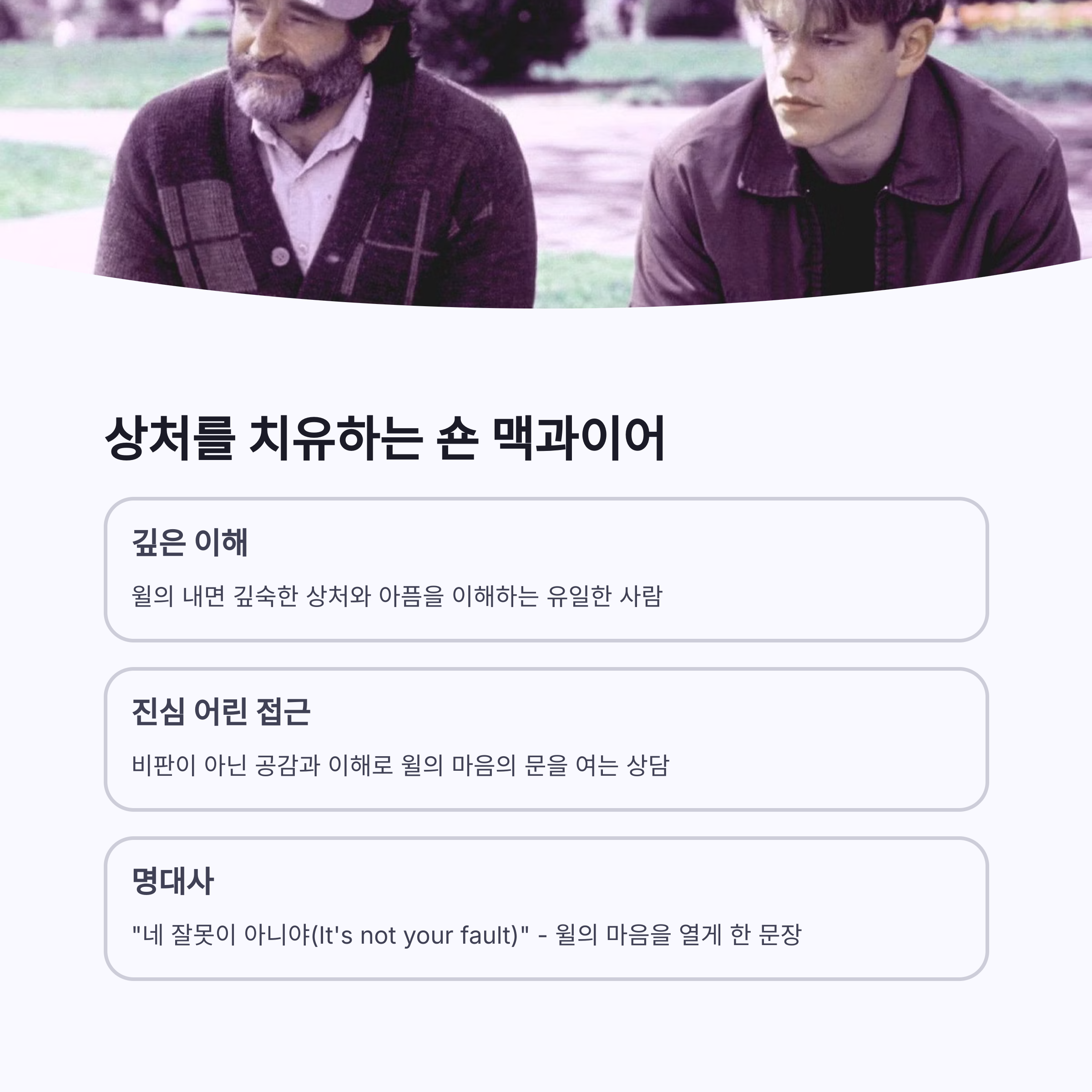 『굿 윌 헌팅』에서 가장 빛나는 존재는 단연 로빈 윌리엄스가 연기한 심리학자 숀 맥과이어입니다. 그는 과거의 상처와 아픔을 경험한 인물로, 윌 헌팅과의 상담을 통해 자신의 경험을 바탕으로 진심 어린 공감과 위로를 전달합니다. 처음 윌과의 만남은 순탄하지 않았습니다. 윌은 숀의 진심을 믿지 않고 냉소적인 태도로 일관하지만, 숀은 윌의 공격적인 태도에 흔들리지 않고 오히려 진정성을 가지고 다가갑니다. 특히 숀이 윌에게 "네 잘못이 아니야"라는 말을 반복적으로 전하는 장면은 영화 역사상 가장 감동적이고 상징적인 순간으로 남아 있습니다.