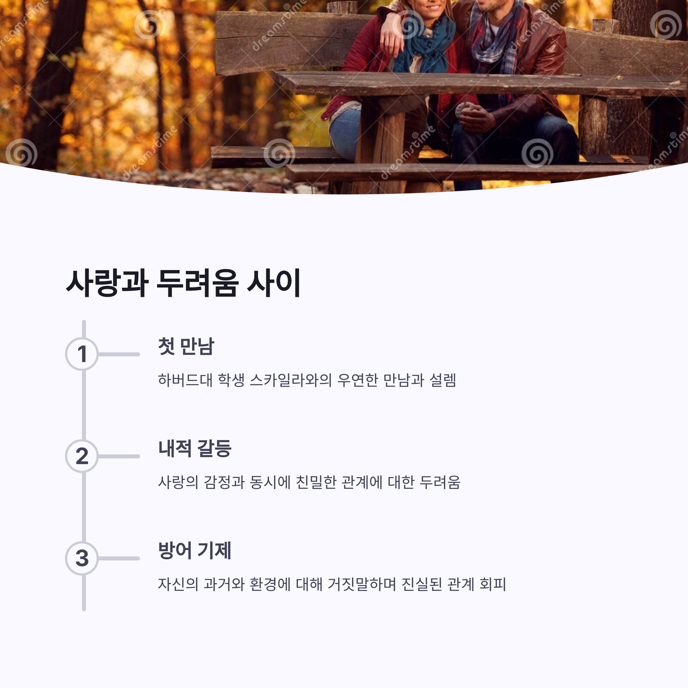 영화 속에서 윌 헌팅은 하버드 대학생 스카일라(미니 드라이버)를 만나 진정한 사랑을 경험하게 됩니다. 그러나 그는 사랑의 감정조차 과거의 상처로 인해 제대로 표현하지 못하고 두려워합니다. 스카일라는 윌에게 순수한 사랑을 전하지만, 윌은 자신의 약점과 과거가 그녀에게 상처를 줄까 두려워하며 도망치듯 떠나버립니다. 영화는 이런 윌의 내적 갈등과 두려움을 현실적으로 묘사하며 사랑과 인간관계에서 오는 진정한 성숙의 의미를 되새기게 합니다.