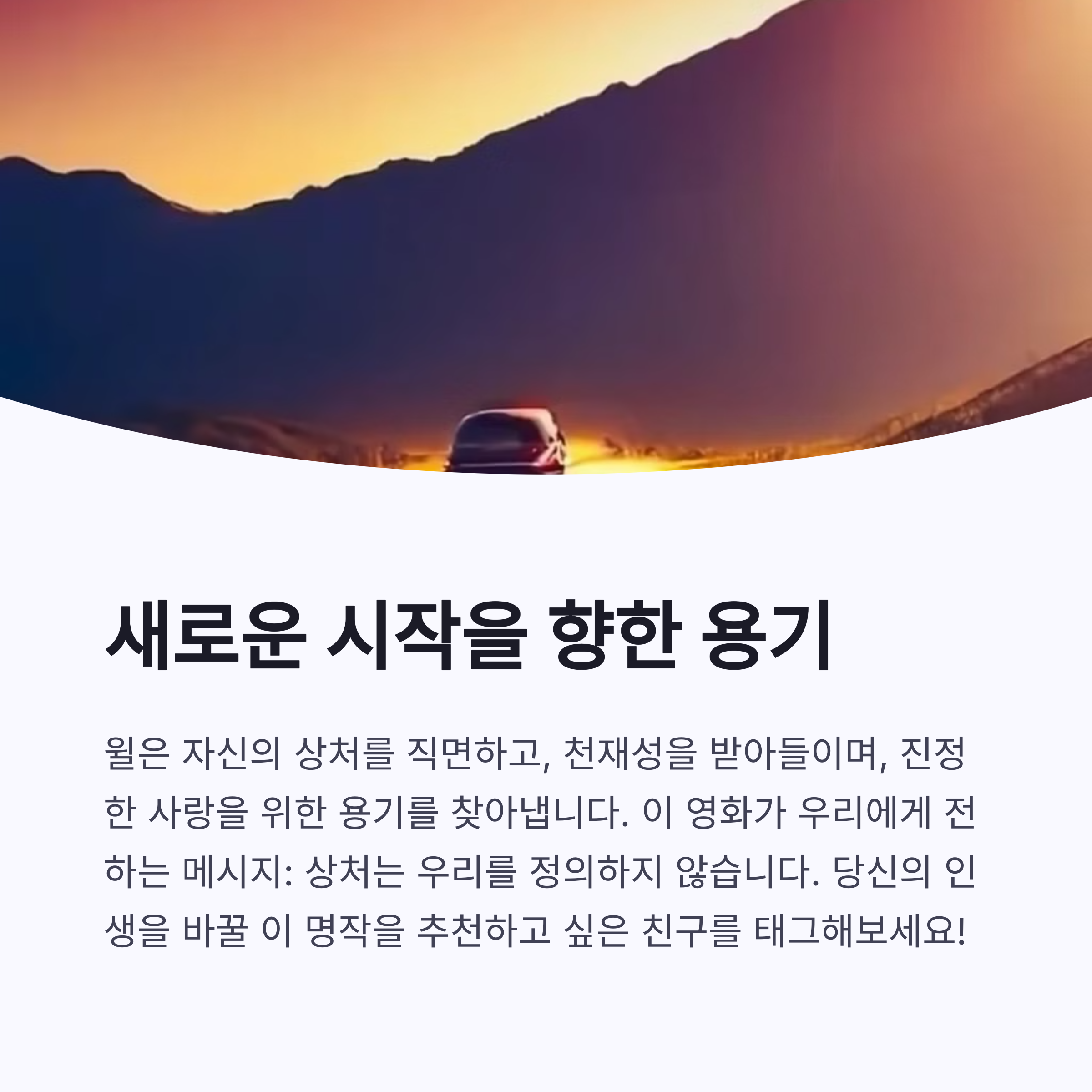 윌은 숀과의 상담, 스카일라와의 사랑, 척키와의 우정을 통해 자신의 재능과 가능성을 받아들이고, 마침내 새로운 인생의 길을 선택하게 됩니다. 이처럼 영화는 인간이 성장하기 위해서는 내면의 상처를 인정하고, 사랑과 우정을 통해 치유하고 나아가는 과정이 필수적임을 강렬하게 전달합니다.