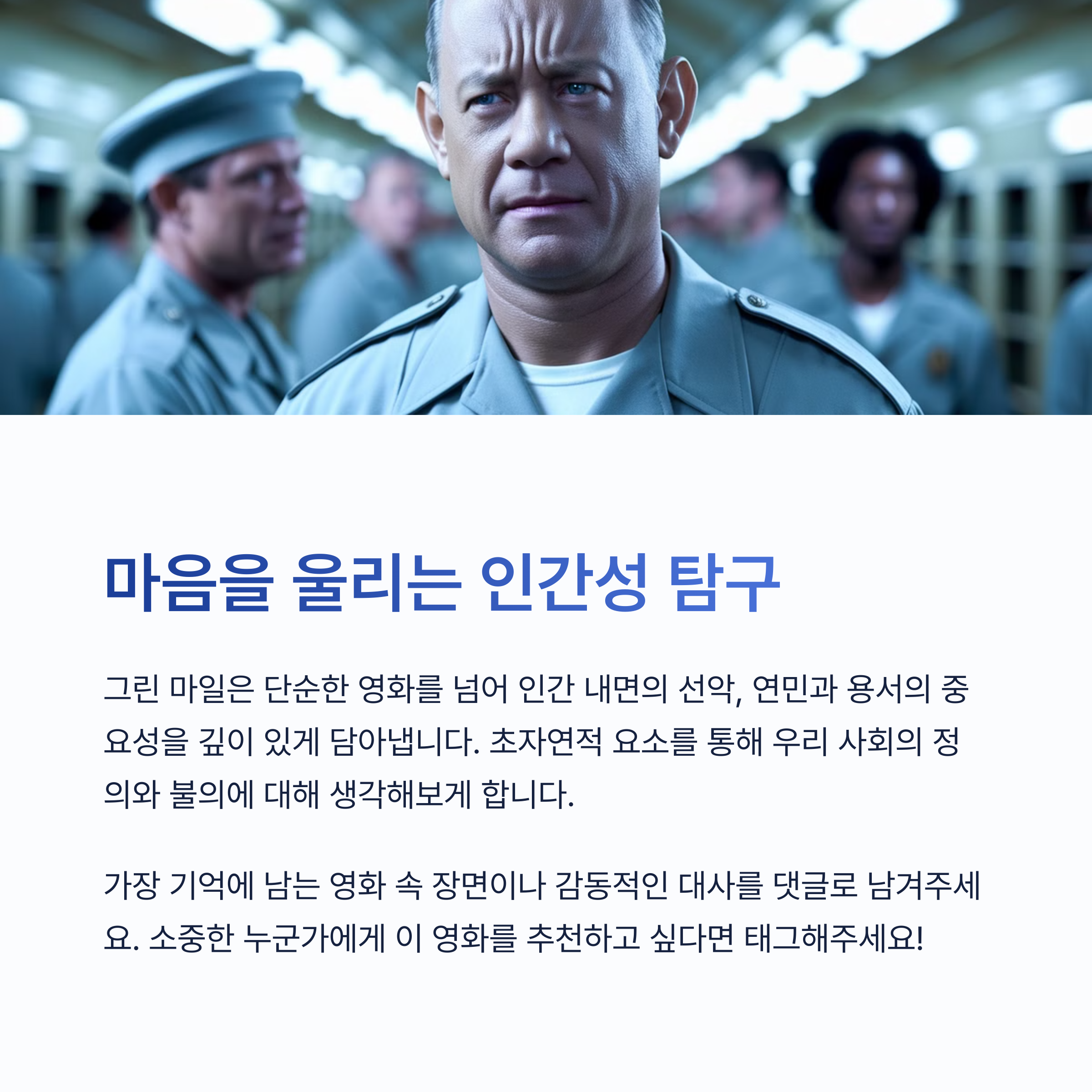 "그린 마일"은 인간성, 정의, 삶과 죽음의 문제를 진지하게 탐구하며 관객들에게 깊은 울림을 줍니다. 극형제도의 모순과 인간 내면의 선악을 강렬한 이야기와 연기로 전달하며, 단순히 영화를 보는 것을 넘어 삶과 죽음에 대한 진지한 고민을 이끌어냅니다. 넷플릭스에서 만나볼 수 있는 이 영화는 한번쯤 깊은 성찰을 원하는 이들에게 강력히 추천할 만한 작품입니다.