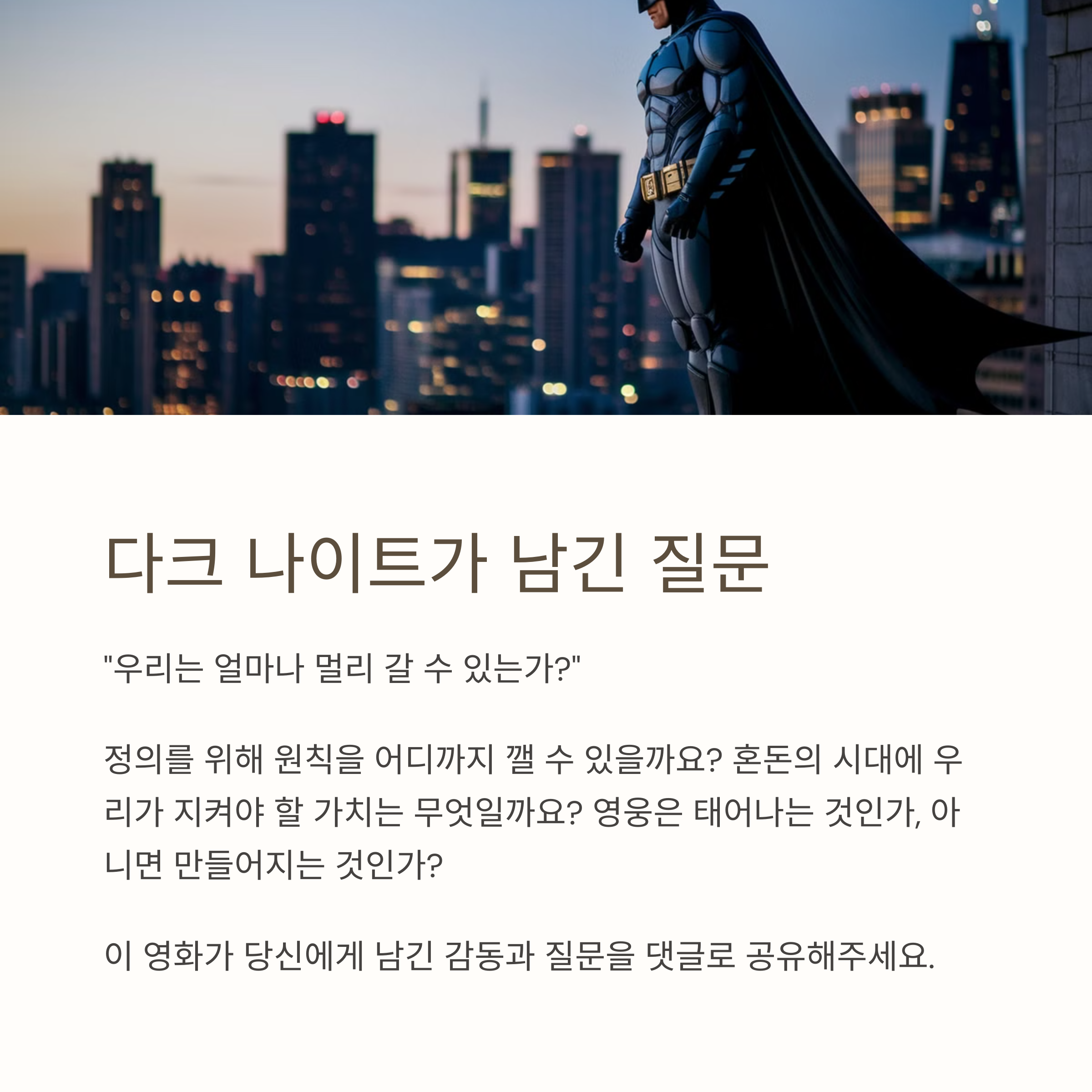 '다크 나이트'가 개봉한 지 15년이 지난 지금도, 이 작품이 던진 질문들은 여전히 유효합니다. 그리고 앞으로도 오랫동안 많은 영화 팬들과 창작자들에게 영감을 줄 것입니다. 마치 배트맨이 고담시를 지키는 것처럼, '다크 나이트'는 영화사의 중요한 이정표로 영원히 남을 것입니다.