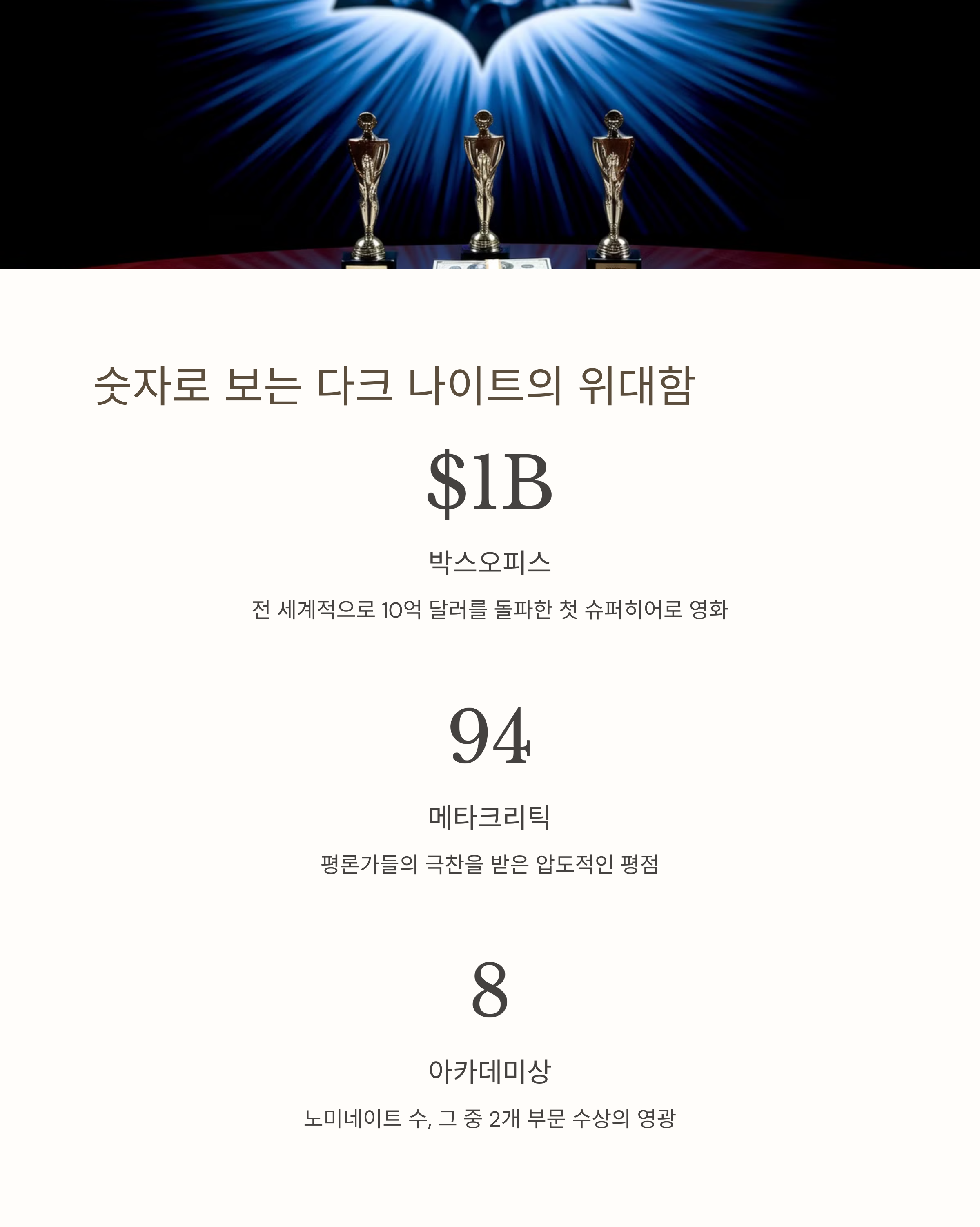 '다크 나이트'는 10억 달러가 넘는 전 세계 박스오피스 수익을 올리며 당시 슈퍼히어로 영화로는 최고 흥행 기록을 세웠습니다. 국내에서도 개봉 당시 400만 명이 넘는 관객을 동원했으며, IMDB 평점 9.0을 유지하며 영화 역사상 손꼽히는 작품으로 자리매김했습니다.