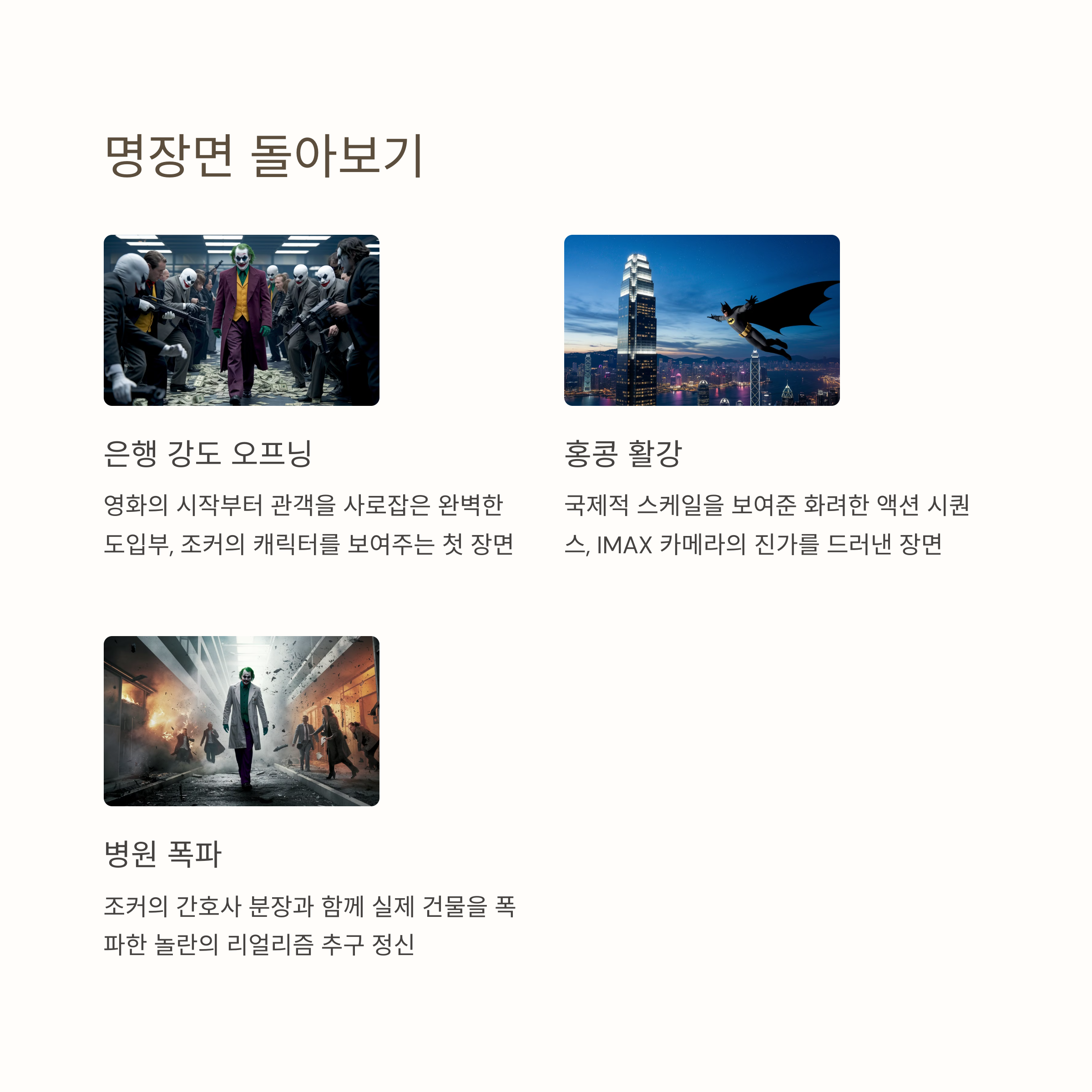 처음 극장에서 '다크 나이트'를 봤던 날은 아직도 선명하게 기억납니다. 영화가 끝나고 자리에서 일어날 수 없을 만큼 압도당했던 경험은 "백문이 불여일견"이라는 말처럼 직접 보지 않고는 설명하기 어려운 감동이었습니다.