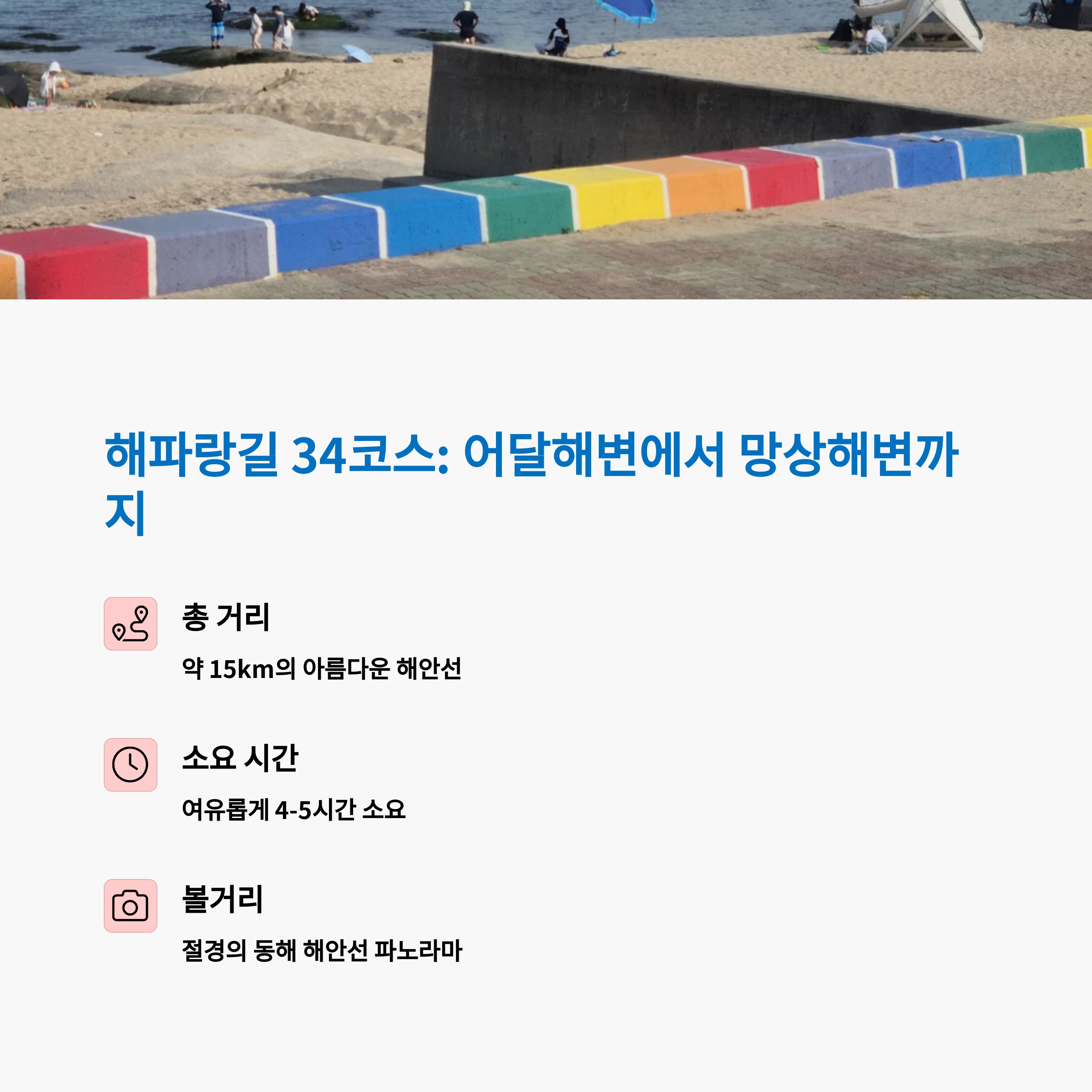 해파랑길 34코스는 동해시 어달해변에서 시작해 망상해변까지 약 12km를 잇는 구간이에요. 아침 8시, 어달해변에 첫발을 내디뎠을 때, 파도 소리가 “어서 와!” 하며 반겨주는 듯했죠. 이곳은 해변 길과 소나무 숲이 조화를 이루며 걷는 내내 상쾌함을 선사해요. 발밑 모래가 살짝 미끄러질 때마다 “아차!” 했지만, 곧 익숙해지더라고요. 망상해변에 도착했을 땐 약 3시간이 걸렸는데, 2023년 해파랑길 공식 데이터에 따르면 이 구간의 평균 소요 시간은 3~4시간으로, 초보자도 부담 없이 즐길 수 있어요.
