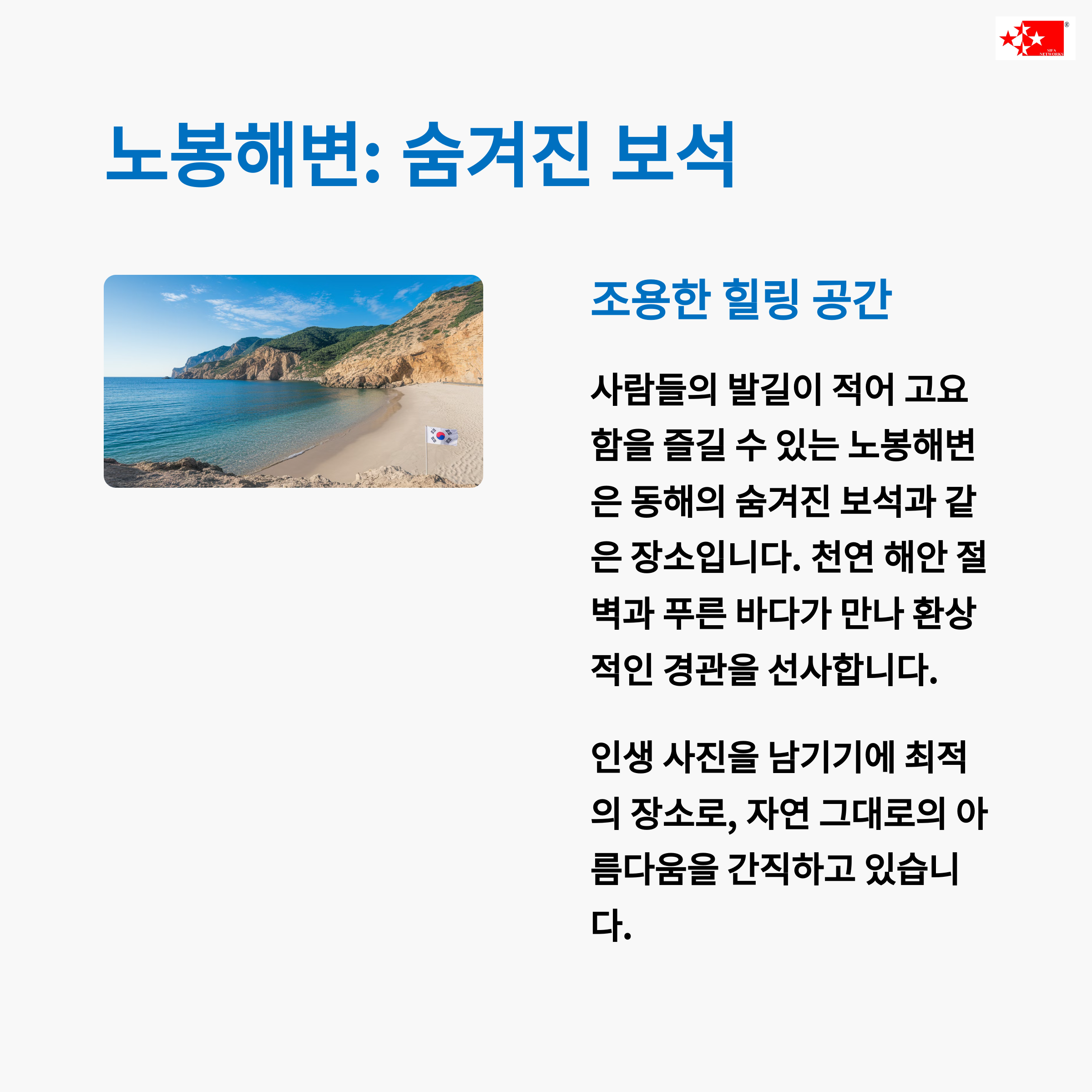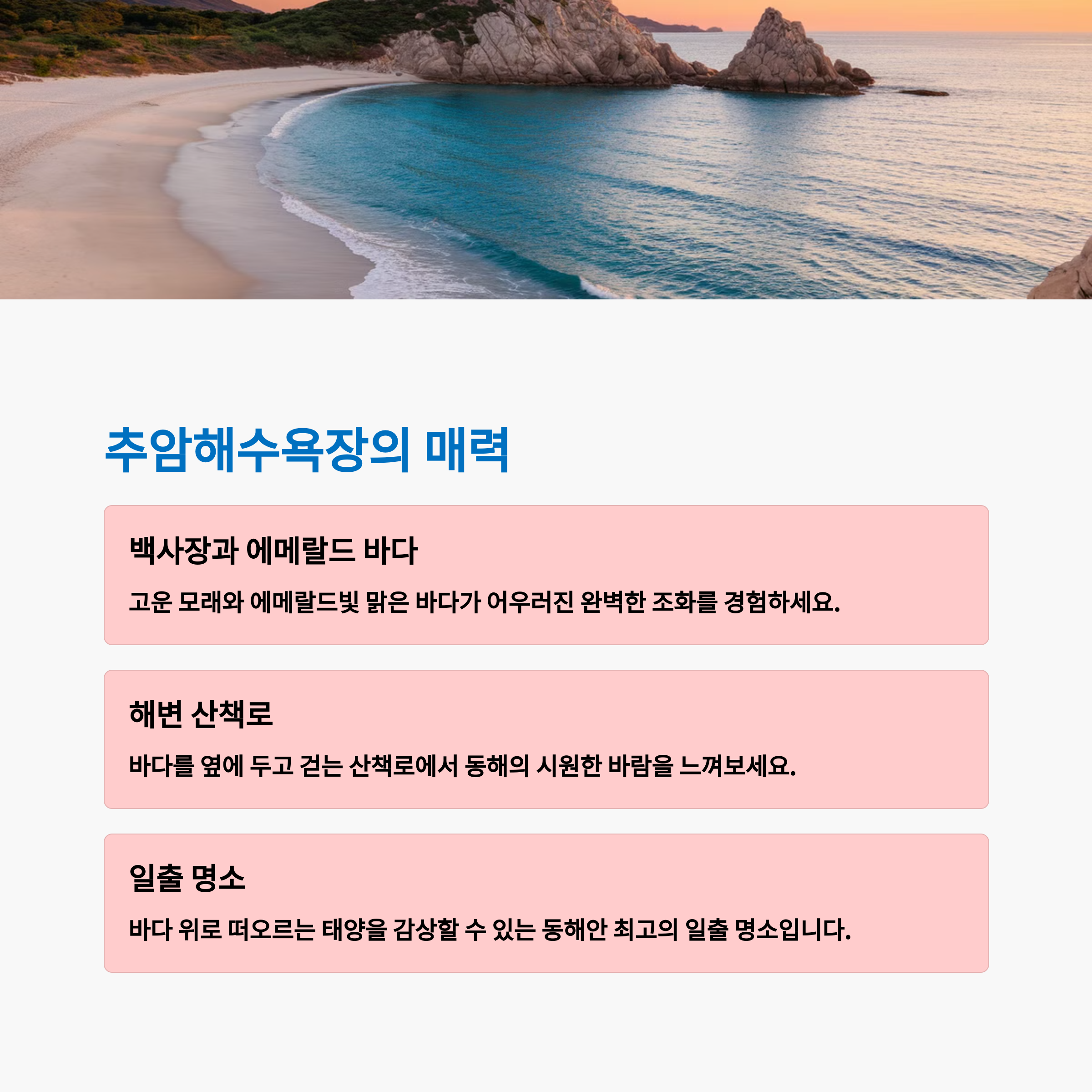 이곳은 2024년 망고플레이트 사용자 투표에서 “동해에서 가장 평화로운 해변” 2위에 올랐어요. 주변에 작은 카페도 있어 따뜻한 커피 한 잔으로 여정을 마무리하기 좋았답니다.