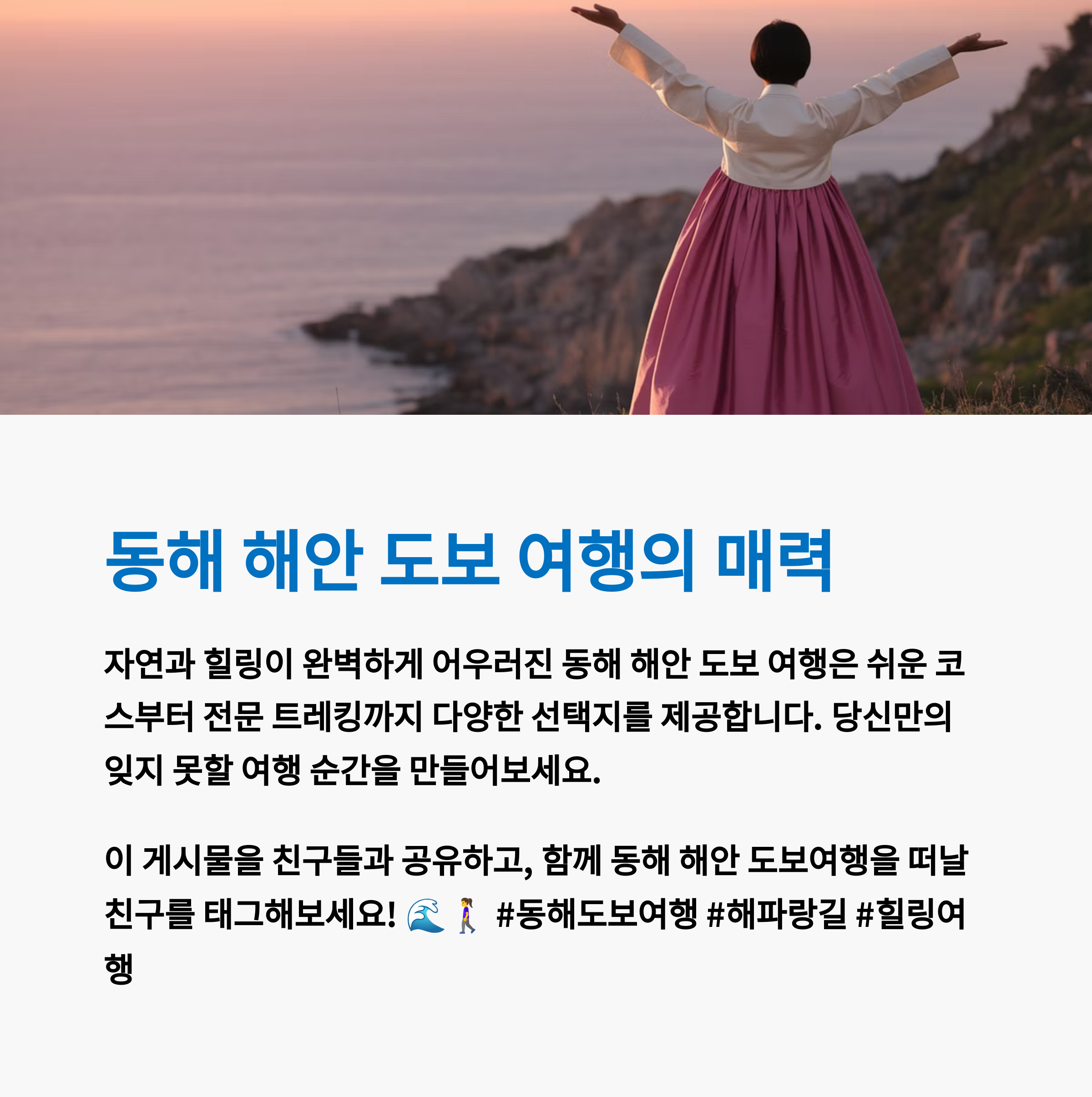 안녕하세요, 길 위의 자유를 사랑하는 여행자 여러분! 오늘은 동해 해안 도보여행 이야기를 풀어보려고 해요. “동해 해안 도보여행, 이렇게 걷기 좋을 줄이야!”라는 말이 절로 나오며 가방을 꾸렸던 그 순간부터, 발걸음마다 느껴지는 설렘이 아직도 생생하네요.