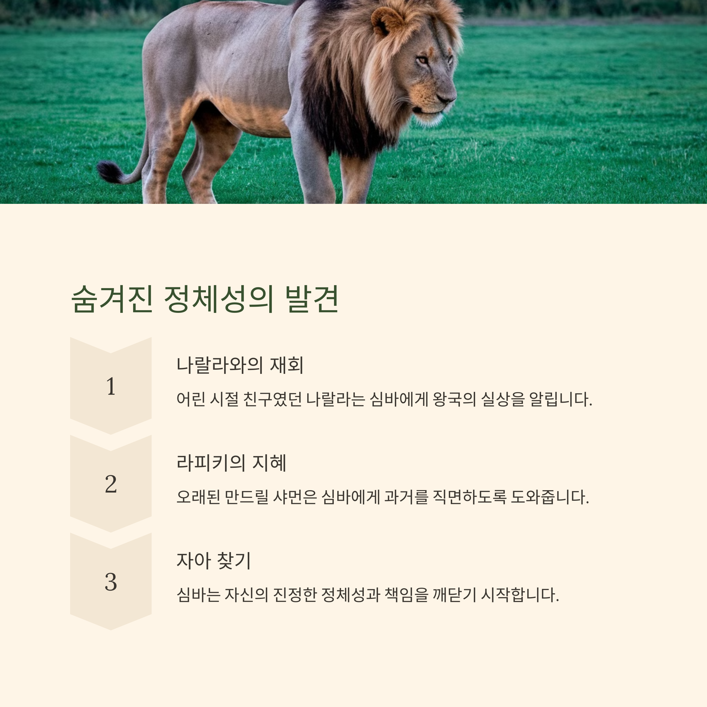 깊은 메시지: 심바의 성장은 용기와 책임감을 강조하며, 남녀노소 누구나 공감할 교훈을 줍니다.