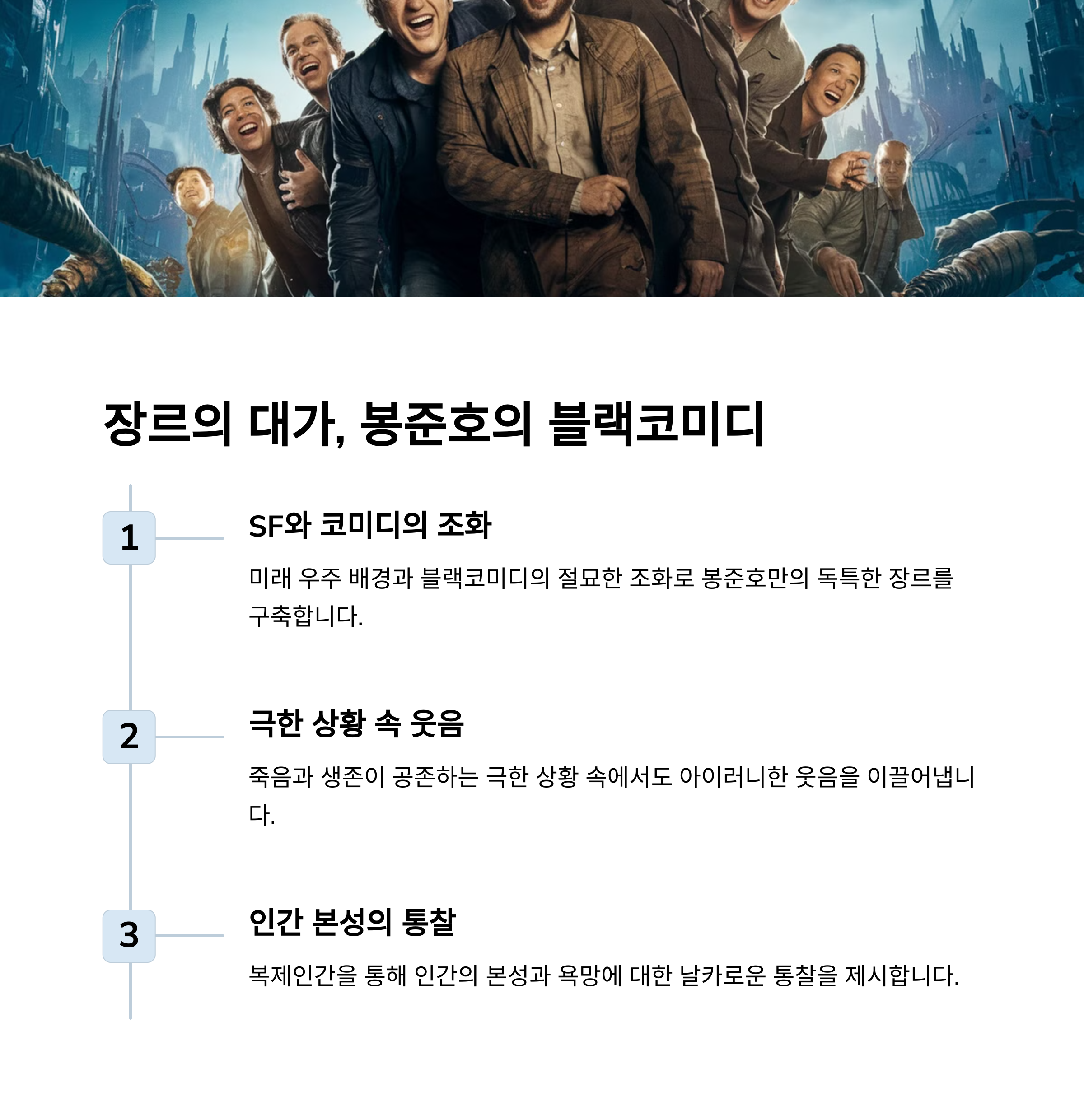 '기생충'으로 아카데미상 4관왕을 차지한 봉준호 감독의 신작은 에드워드 애쉬튼의 소설 '미키7'을 원작으로 합니다. 하지만 '원작의 옷을 입은 전혀 다른 영화'라는 표현이 더 적절할 정도로 봉 감독 특유의 색채로 재해석되었습니다. 1억 1800만 달러(약 1570억 원)의 제작비가 투입된 이 작품은 규모면에서도 기존 그의 작품들을 훌쩍 뛰어넘었습니다.