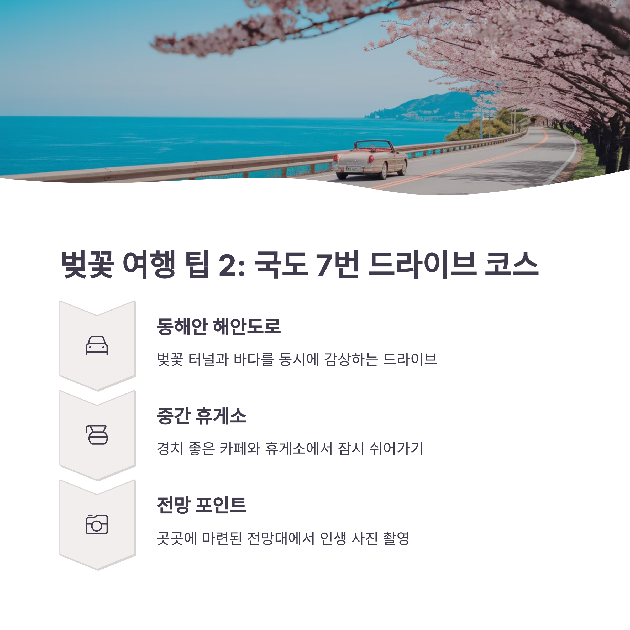 7번 국도 드라이브: 7번 국도를 따라 차로 달리며 벚꽃과 유채꽃을 감상하는 건 동해안 여행의 백미예요. 창밖으로 펼쳐지는 꽃길은 “드라이브의 낭만” 그 자체죠.