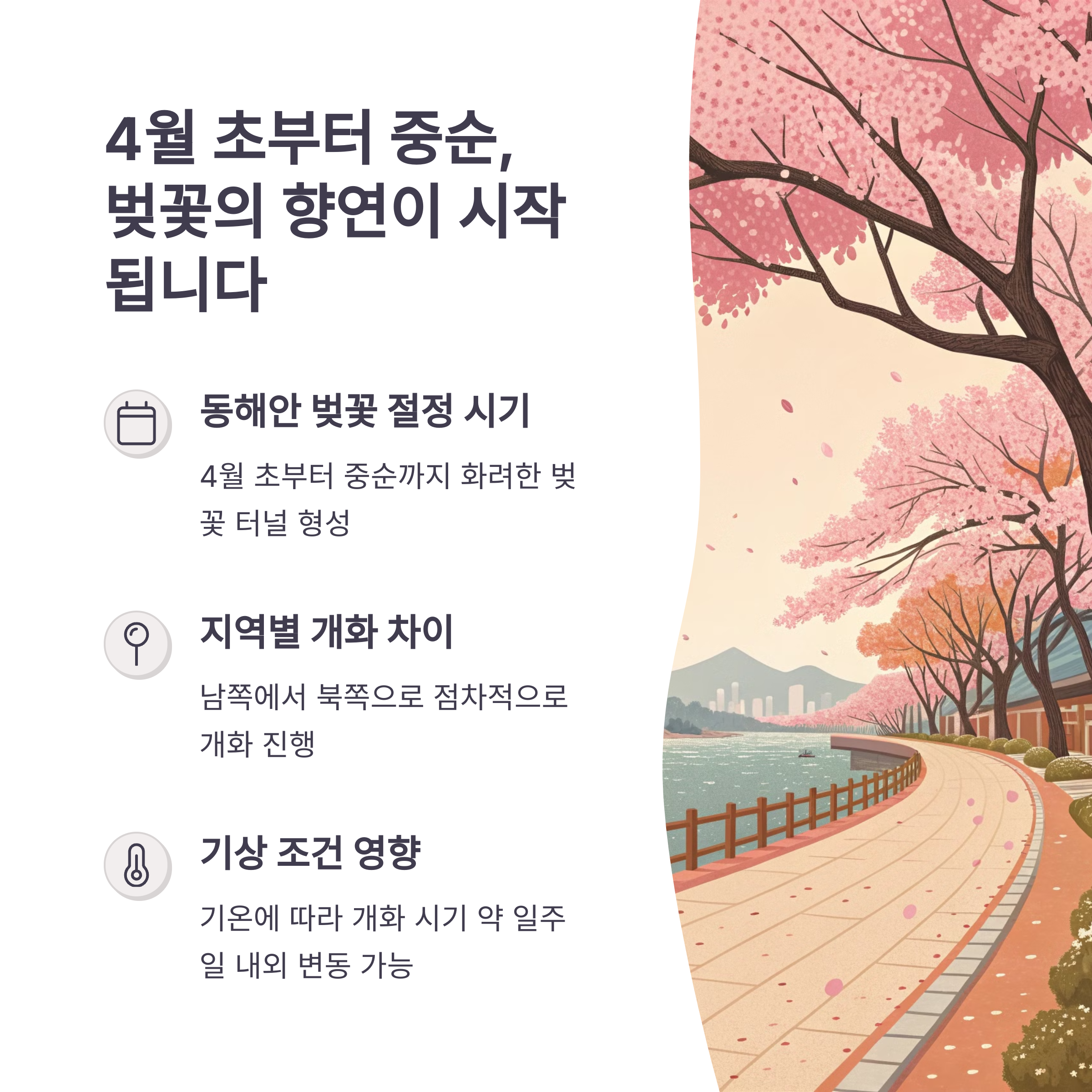 꽃 피는 시기 체크: 동해안 벚꽃은 보통 4월 초부터 중순까지 만개합니다.