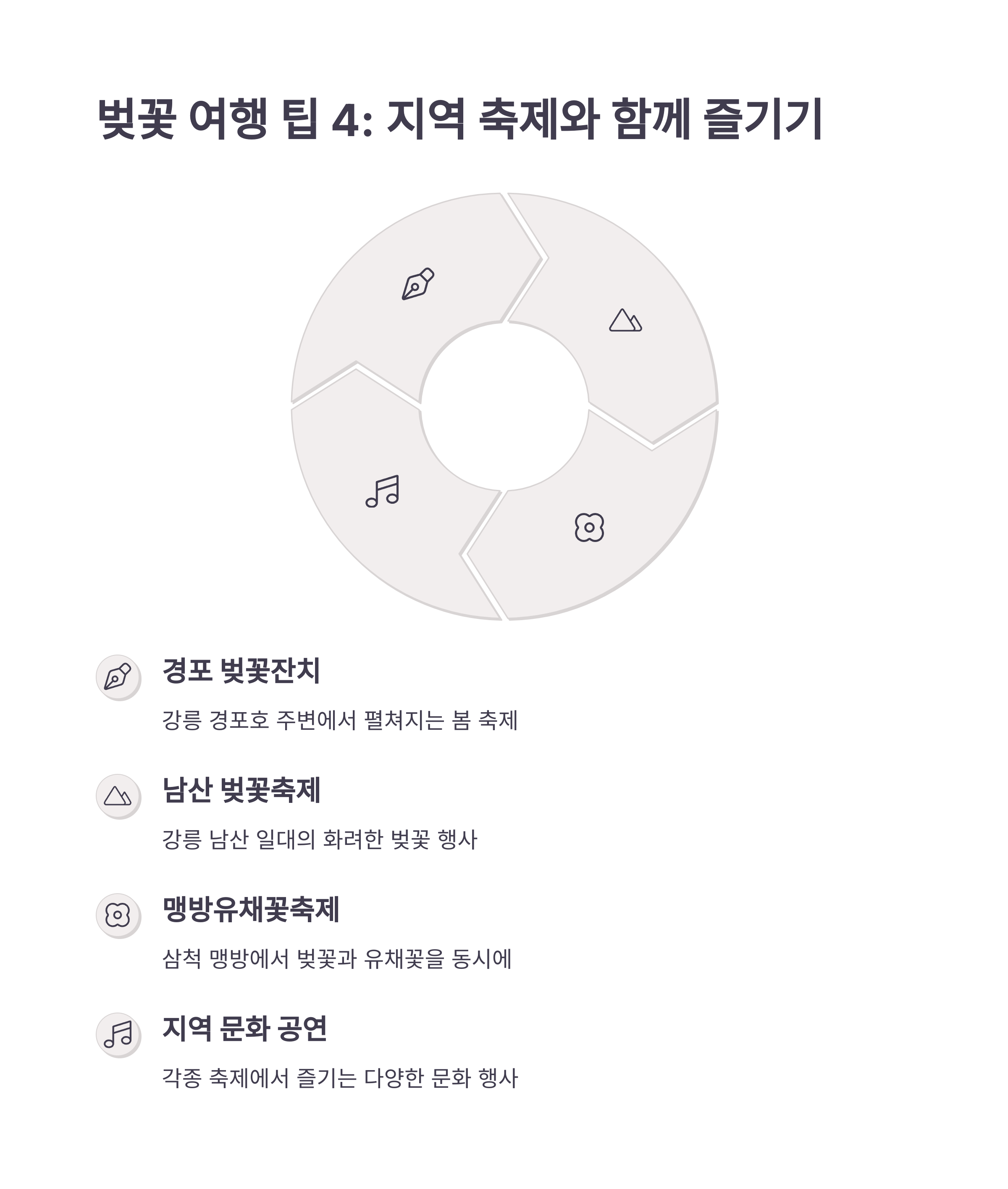 축제 일정 맞추기: 강릉 경포 벚꽃축제, 동해 유천문화축제 등 지역마다 이벤트가 가득합니다. 일정에 맞춰 가면 “축제는 봄의 향연”이라는 걸 실감할 수 있어요.