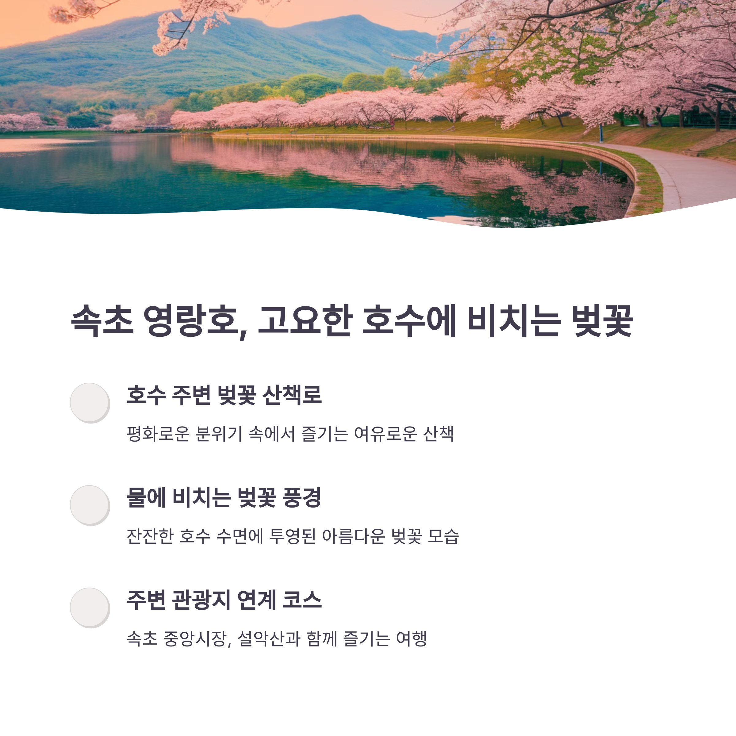 야경 놓치지 않기: 경포호와 전천 벚꽃길의 밤 풍경은 낮과는 또 다른 감동을 줍니다. 해 질 무렵 방문해 두 가지 매력을 모두 누려보세요. “밤의 꽃은 낮보다 더 깊은 이야기를 품고 있다”는 말이 떠오를 거예요.
