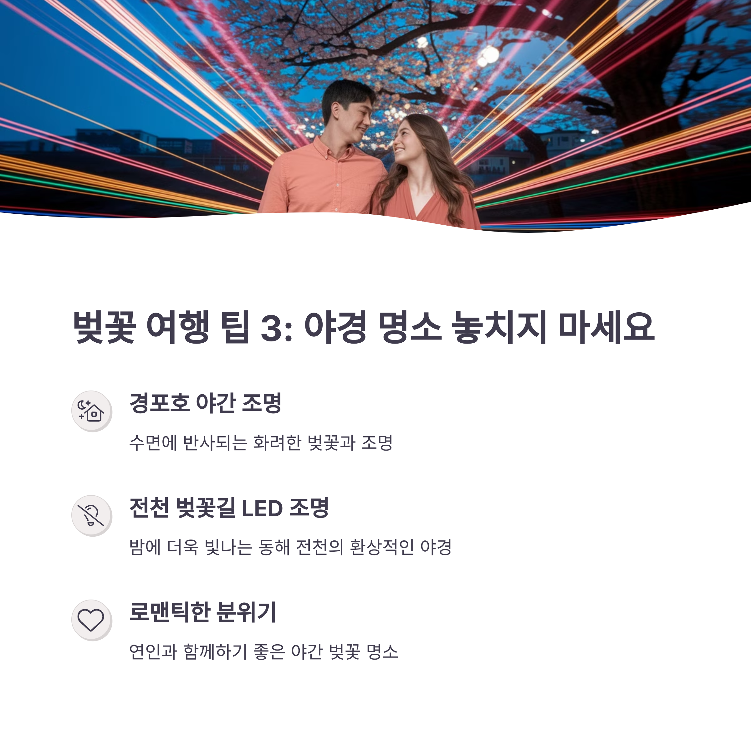 야경 놓치지 않기: 경포호와 전천 벚꽃길의 밤 풍경은 낮과는 또 다른 감동을 줍니다. 해 질 무렵 방문해 두 가지 매력을 모두 누려보세요. “밤의 꽃은 낮보다 더 깊은 이야기를 품고 있다”는 말이 떠오를 거예요.