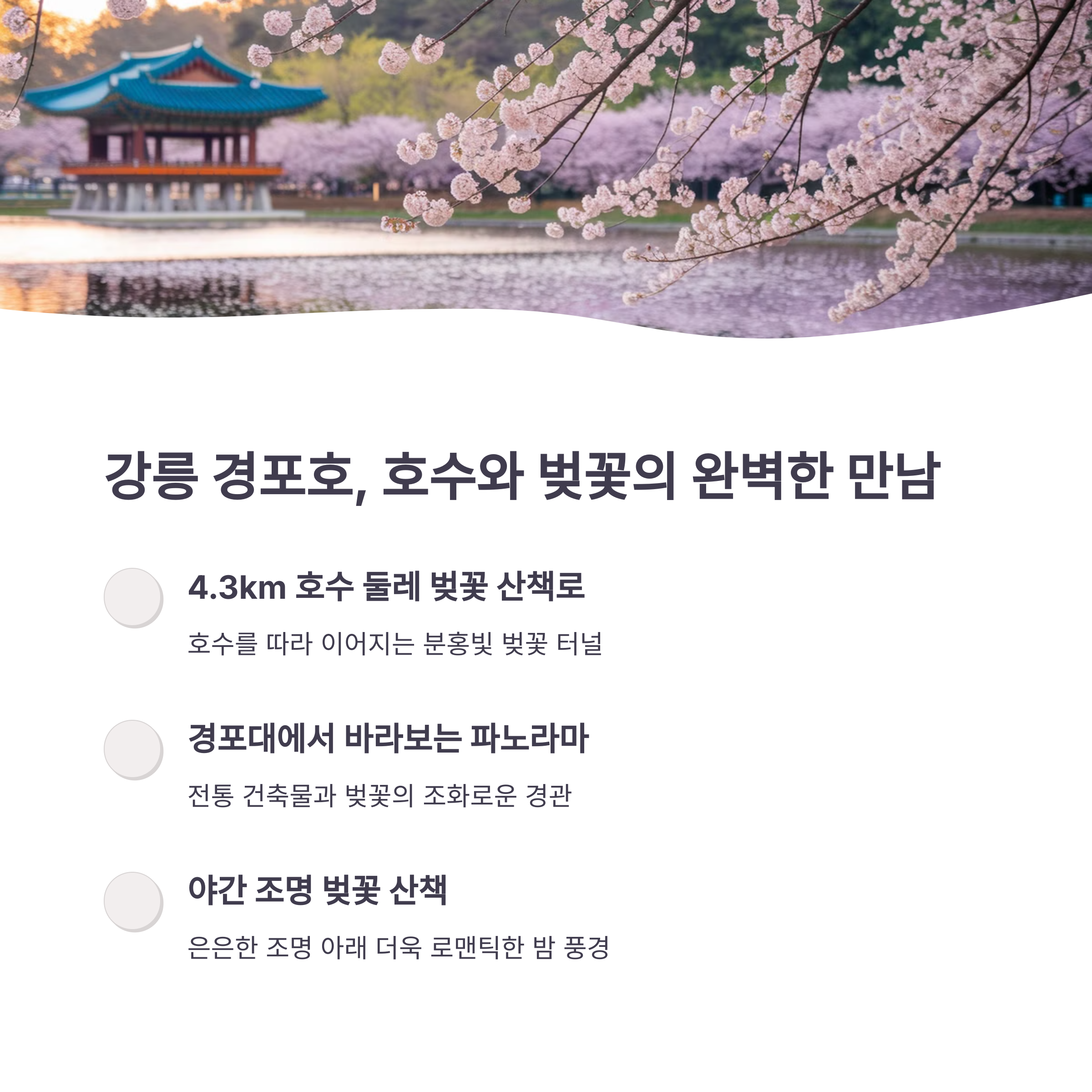 1. 강릉 경포호 벚꽃길: 호수 위에 피어난 봄의 꿈