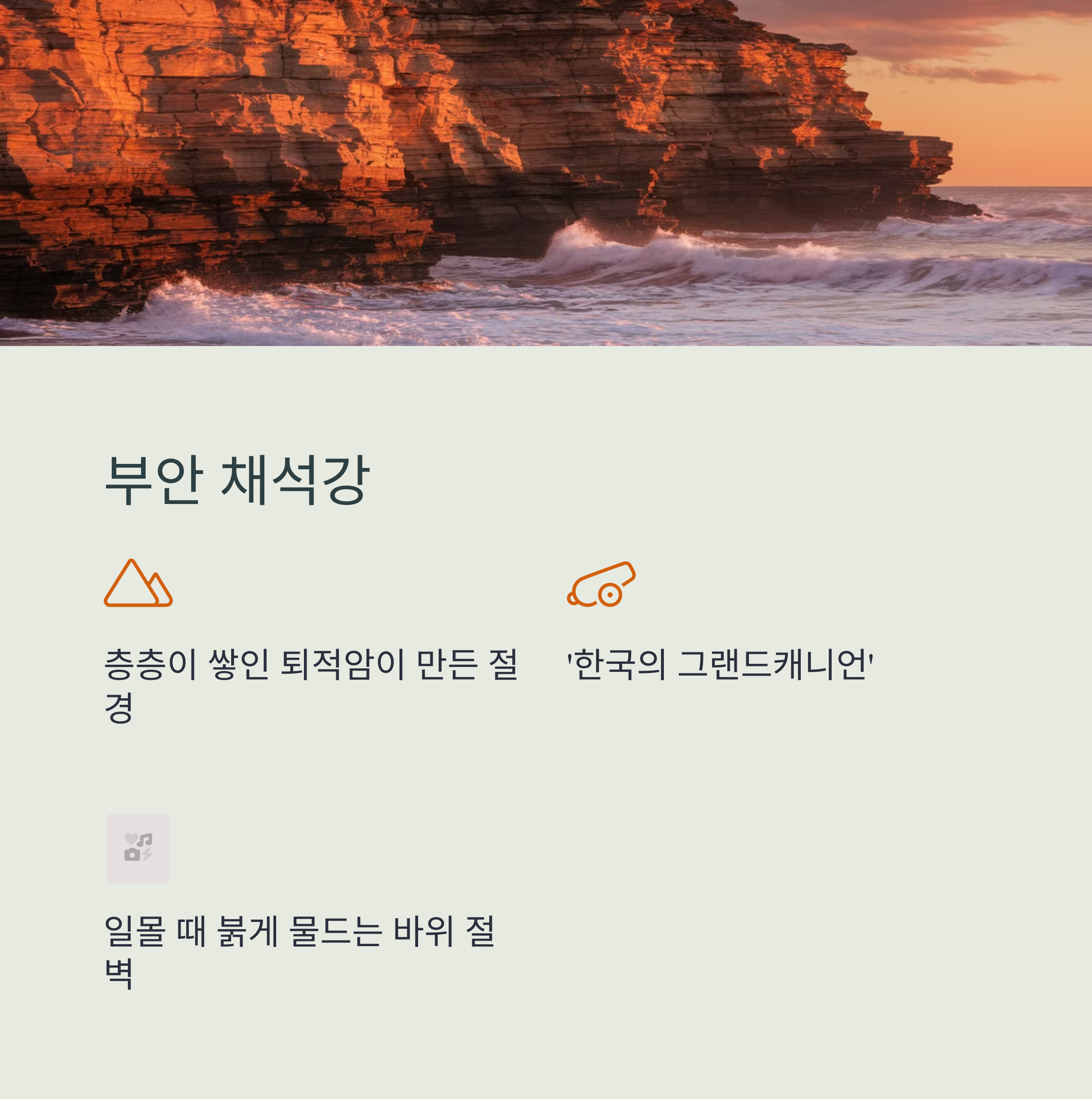 부안 채석강은 층층이 쌓인 절벽과 바다가 어우러진 신비로운 장소예요. 이곳의 바위들은 마치 지구가 태어났던 시절의 흔적을 간직한 듯한 느낌을 주는데, 일몰 때는 그 위로 붉은빛이 내려앉아 장관을 이룹니다. 제가 방문했을 때, 한 여행객이 “이건 인터스텔라의 한 장면 같아요!”라고 감탄하던 모습이 기억나네요. 실제로 채석강은 그 독특한 지형 덕분에 연간 약 50만 명 이상이 찾는 명소로 자리 잡았어요. 노을을 바라보며 “세상의 끝에 서 있는 기분”을 느껴보세요. 자연의 위대함에 감동받아 눈물이 핑 돌지도 몰라요!
