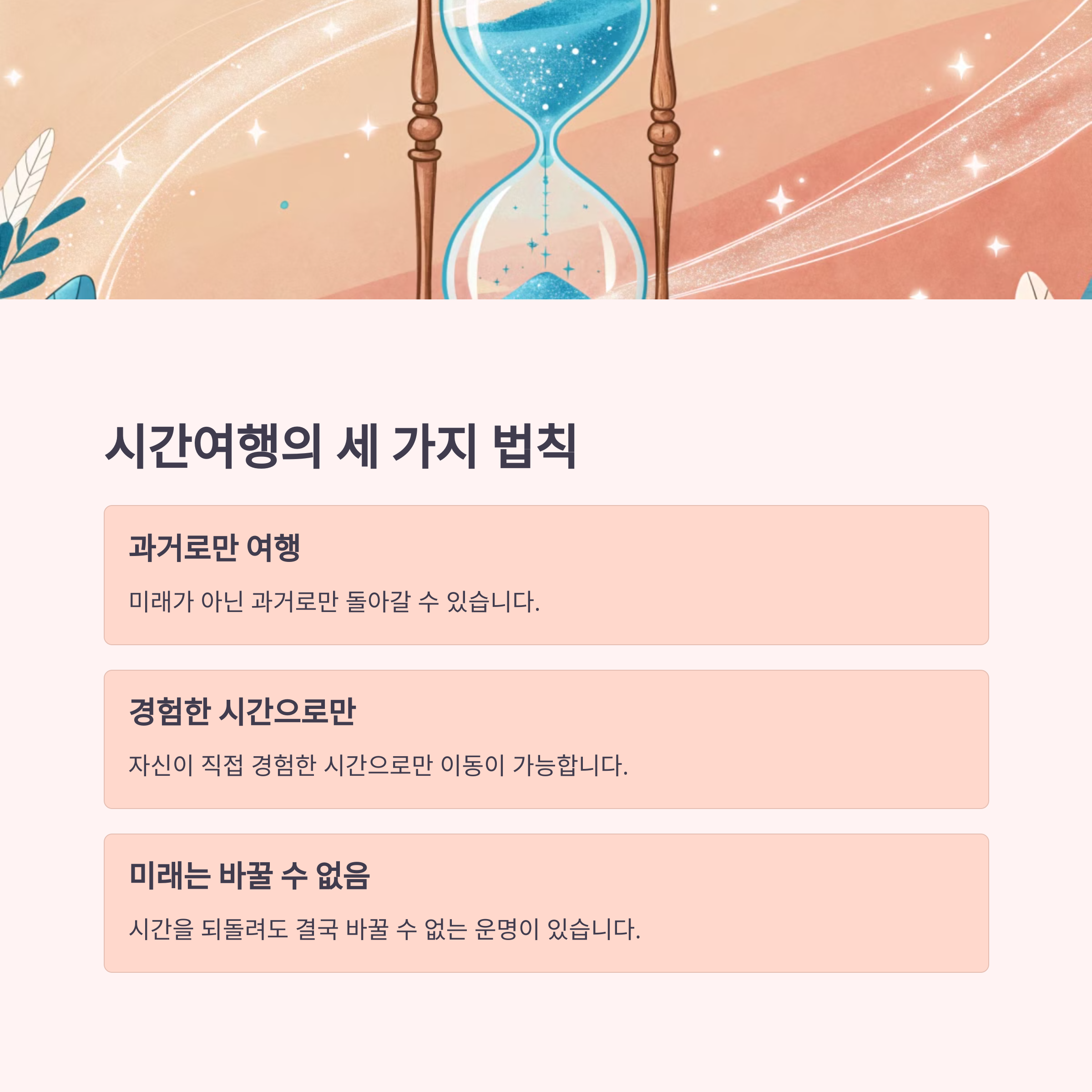 "발 없는 말이 천리 간다"는 속담처럼, 우리의 선택과 행동은 시간이라는 강을 타고 멀리 퍼져나갑니다. 어쩌면 진정한 시간여행은 과거를 바꾸는 것이 아니라, 지금 이 순간 최선의 선택을 하여 미래를 바꾸는 것인지도 모릅니다.