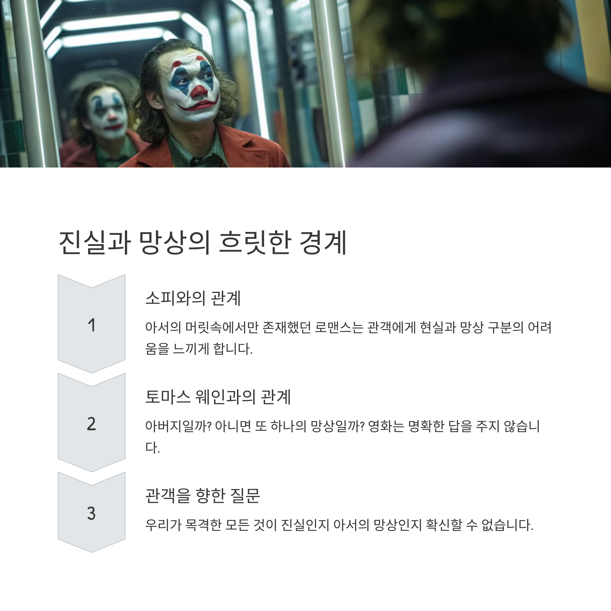 저는 이 영화를 극장에서 세 번이나 관람했습니다. 매번 볼 때마다 새로운 의미와 상징을 발견했고, 그만큼 깊은 여운을 남겼습니다. '백문이 불여일견(百聞不如一見)'이라는 말처럼, 이 영화는 직접 보고 느끼는 것이 중요합니다. 하지만 오늘은 제가 느낀 '조커'의 심층적 의미에 대해 함께 생각해보고자 합니다.