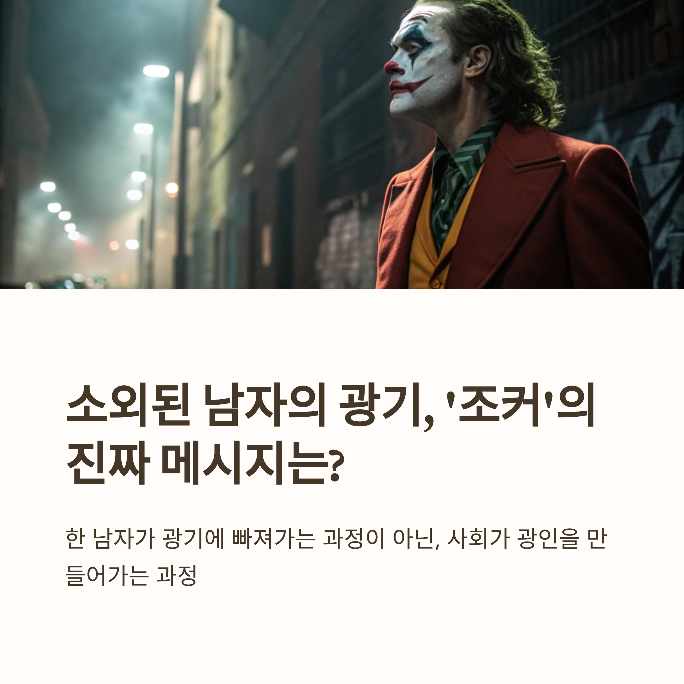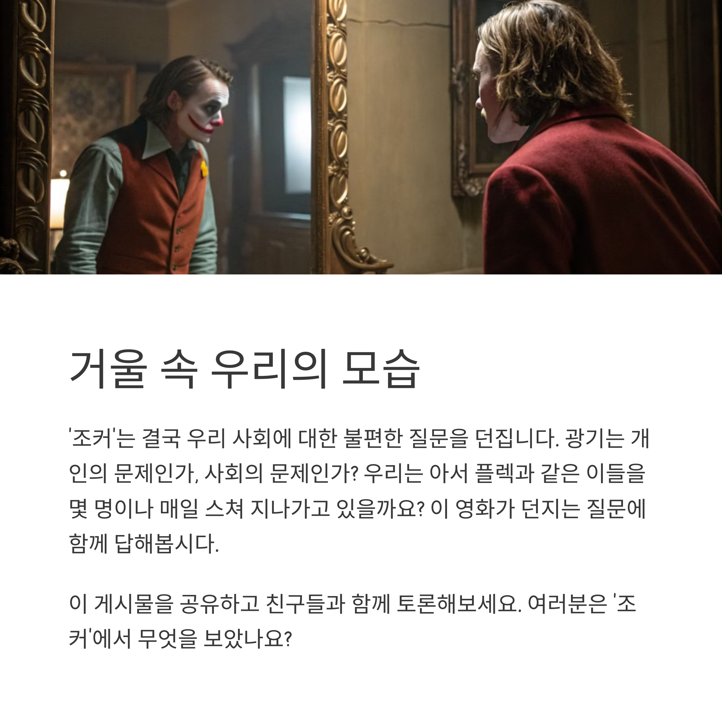 여러분은 이 영화를 보며 어떤 생각을 하셨나요? 조커라는 캐릭터가 여러분에게는 어떤 의미로 다가왔는지, 함께 이야기 나누어 보면 좋겠습니다.
