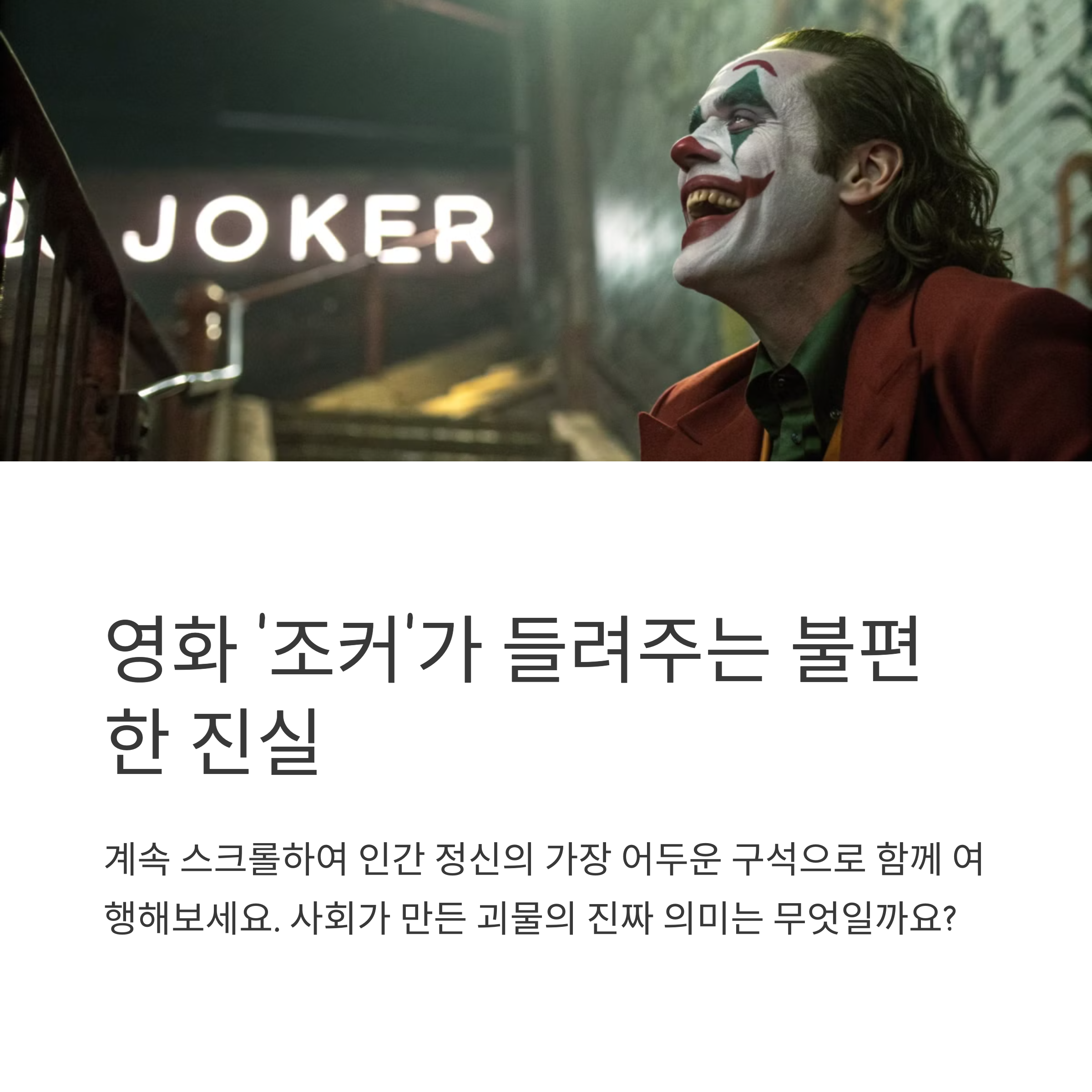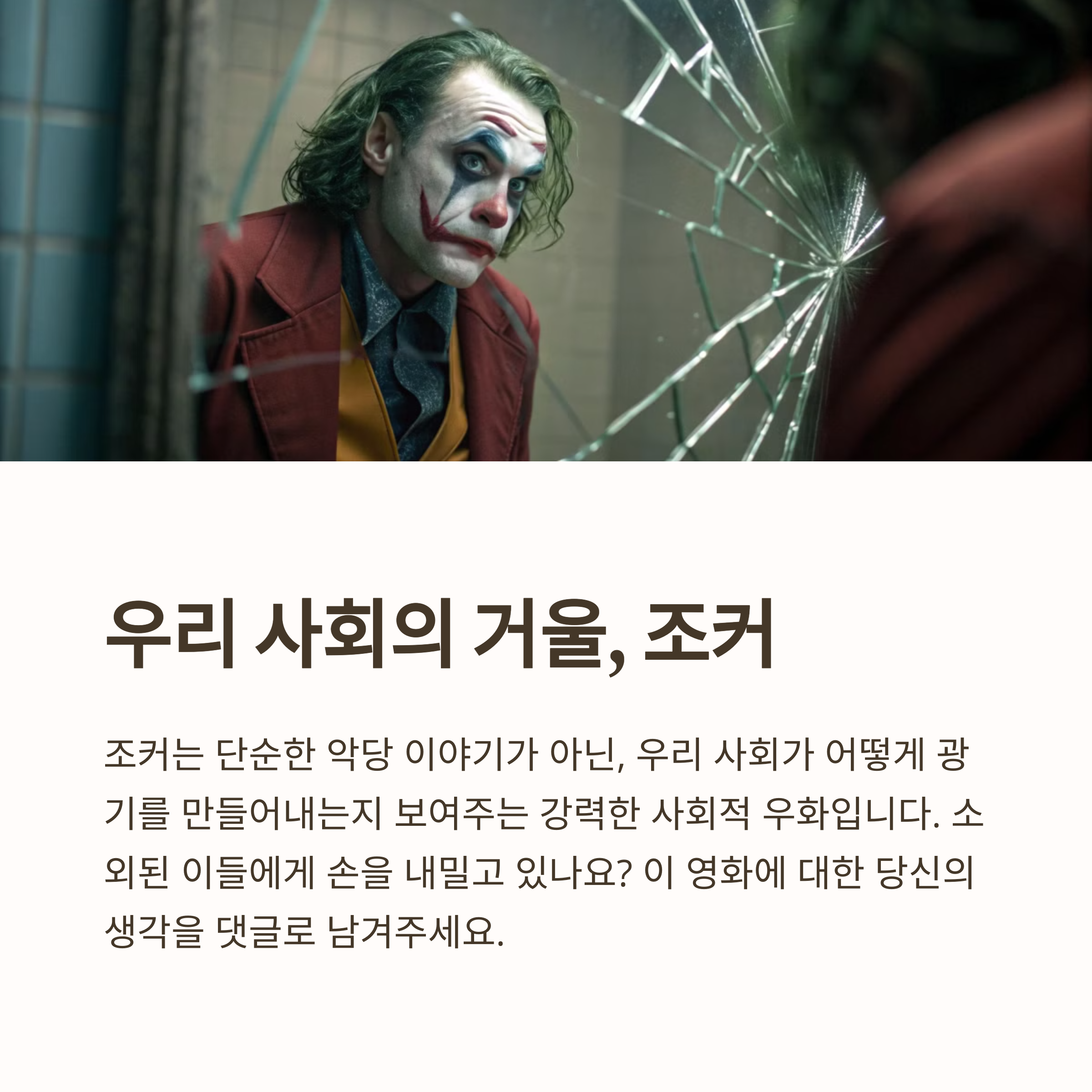 여러분은 이 영화를 보며 어떤 생각을 하셨나요? 조커라는 캐릭터가 여러분에게는 어떤 의미로 다가왔는지, 함께 이야기 나누어 보면 좋겠습니다.
