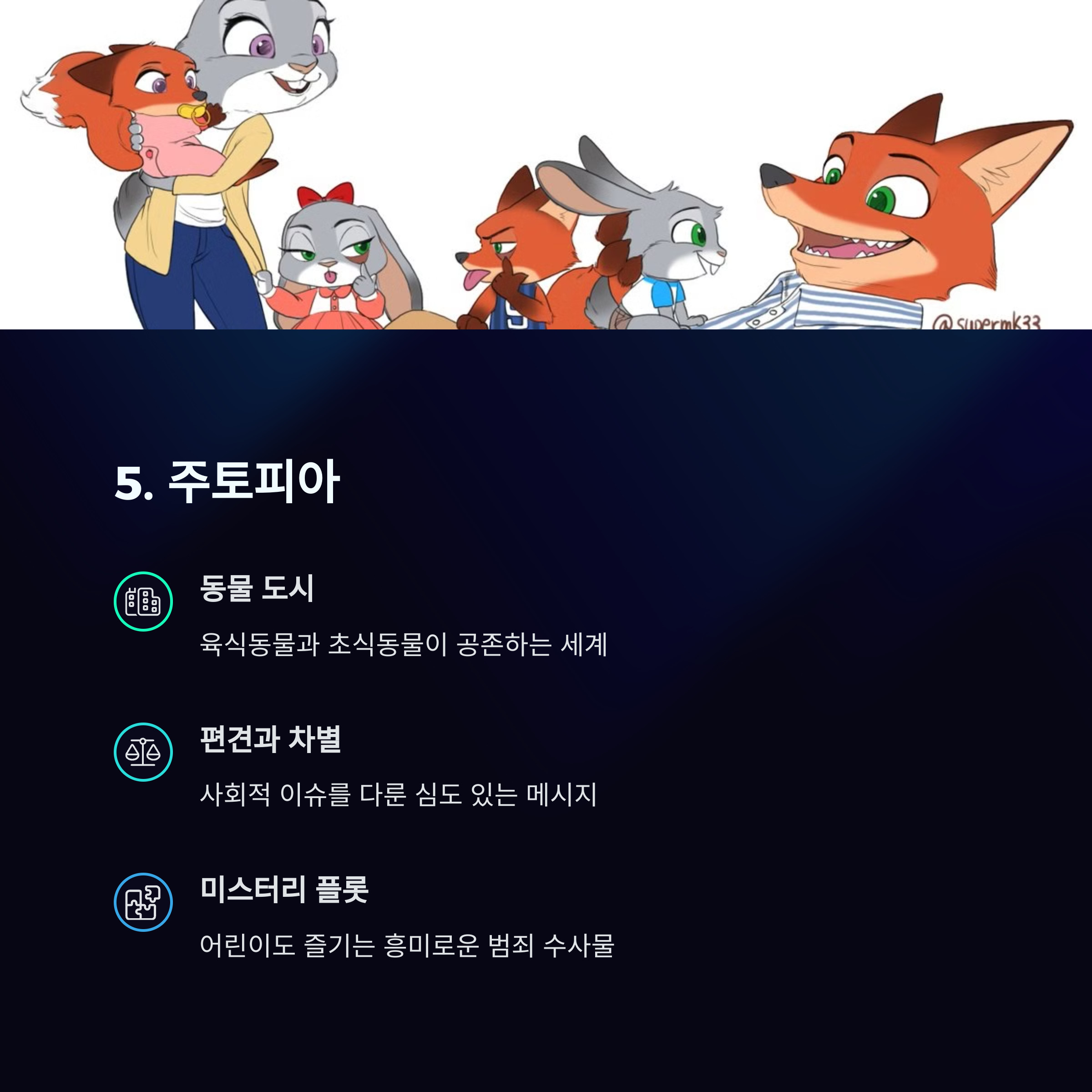 동물들이 인간처럼 살아가는 도시 주토피아를 배경으로 한 이 영화는 토끼 경찰 주디와 사기꾼 여우 닉이 함께 사건을 해결하는 이야기를 담고 있습니다. 편견과 차별을 극복하고 협력하는 모습을 통해 사회적 메시지를 전달하며, 유쾌한 코미디와 감동이 어우러진 작품입니다.