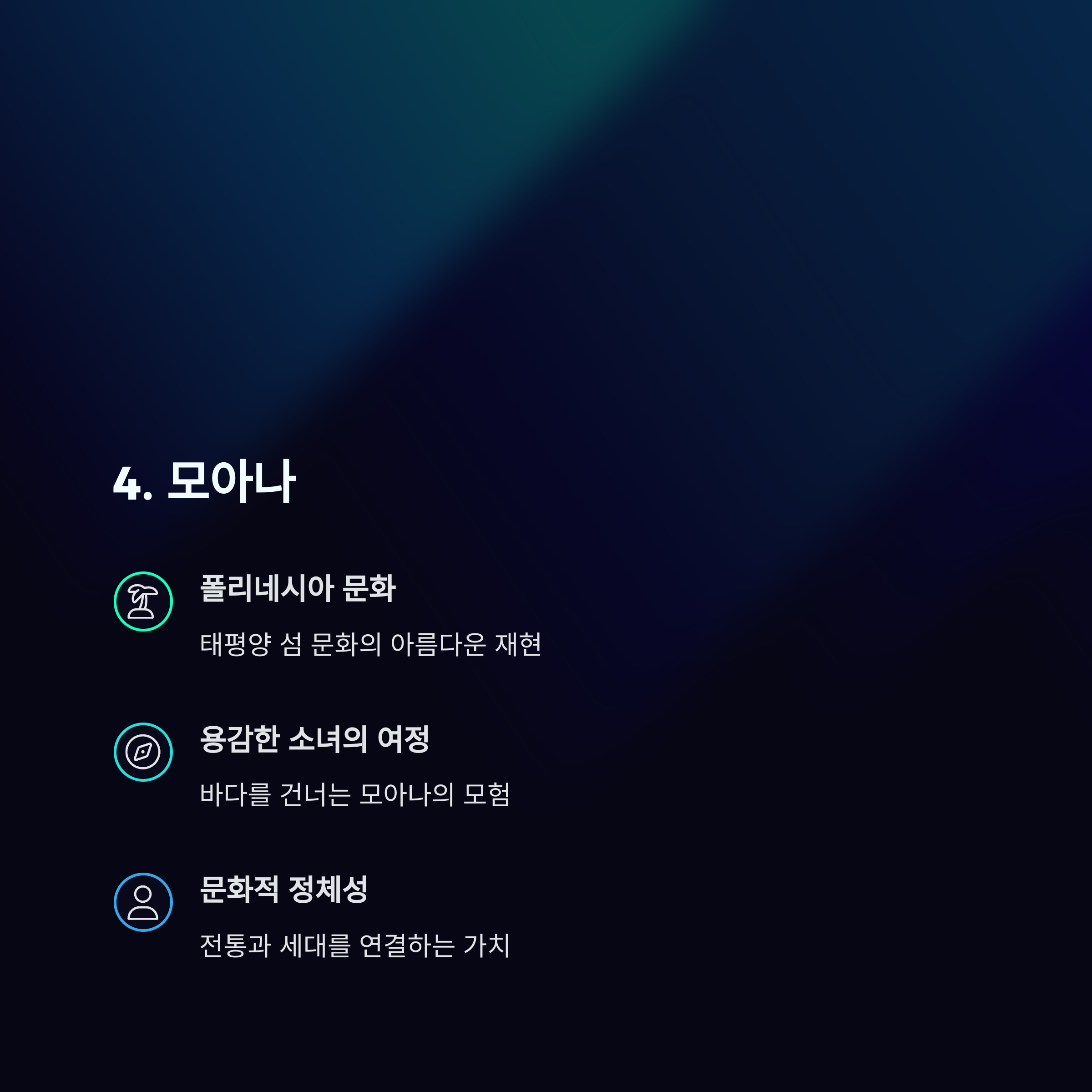 남태평양의 섬을 배경으로 한 이 영화는 바다를 사랑하는 소녀 모아나가 신비로운 섬을 찾아 떠나는 모험을 그립니다. 모아나는 용기와 결단력으로 어려움을 극복하며, 자신의 정체성을 찾아가는 과정을 보여줍니다. 가족 모두가 공감할 수 있는 성장과 모험의 이야기가 펼쳐집니다.
