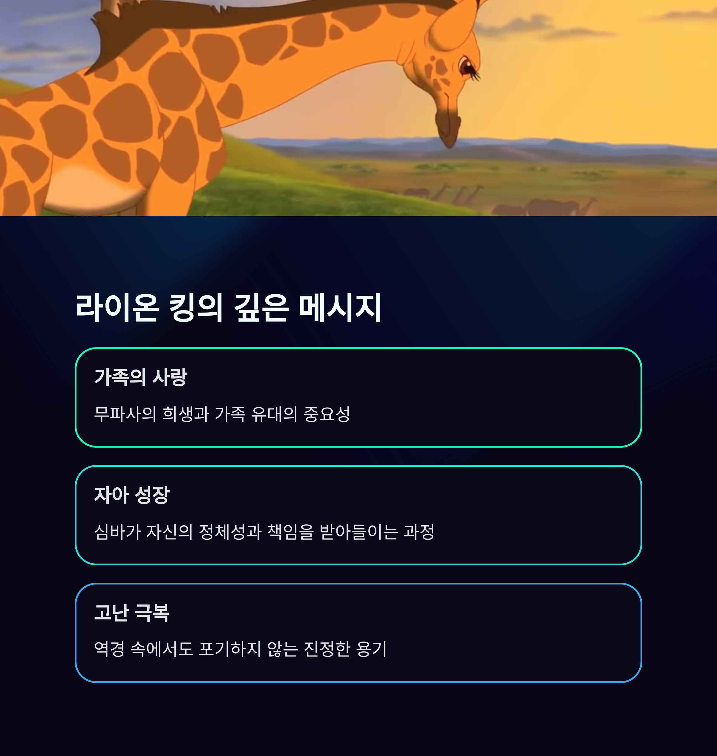 아프리카 사바나를 배경으로 한 이 영화는 어린 사자 심바가 아버지 무파사의 죽음 후 왕위를 되찾기 위해 성장하는 여정을 그립니다. 심바는 친구들과 함께 힘든 시련을 극복하며 진정한 왕으로 거듭납니다. 아름다운 애니메이션과 감동적인 음악, 그리고 용기와 책임감의 메시지가 가족 모두에게 큰 울림을 줍니다.