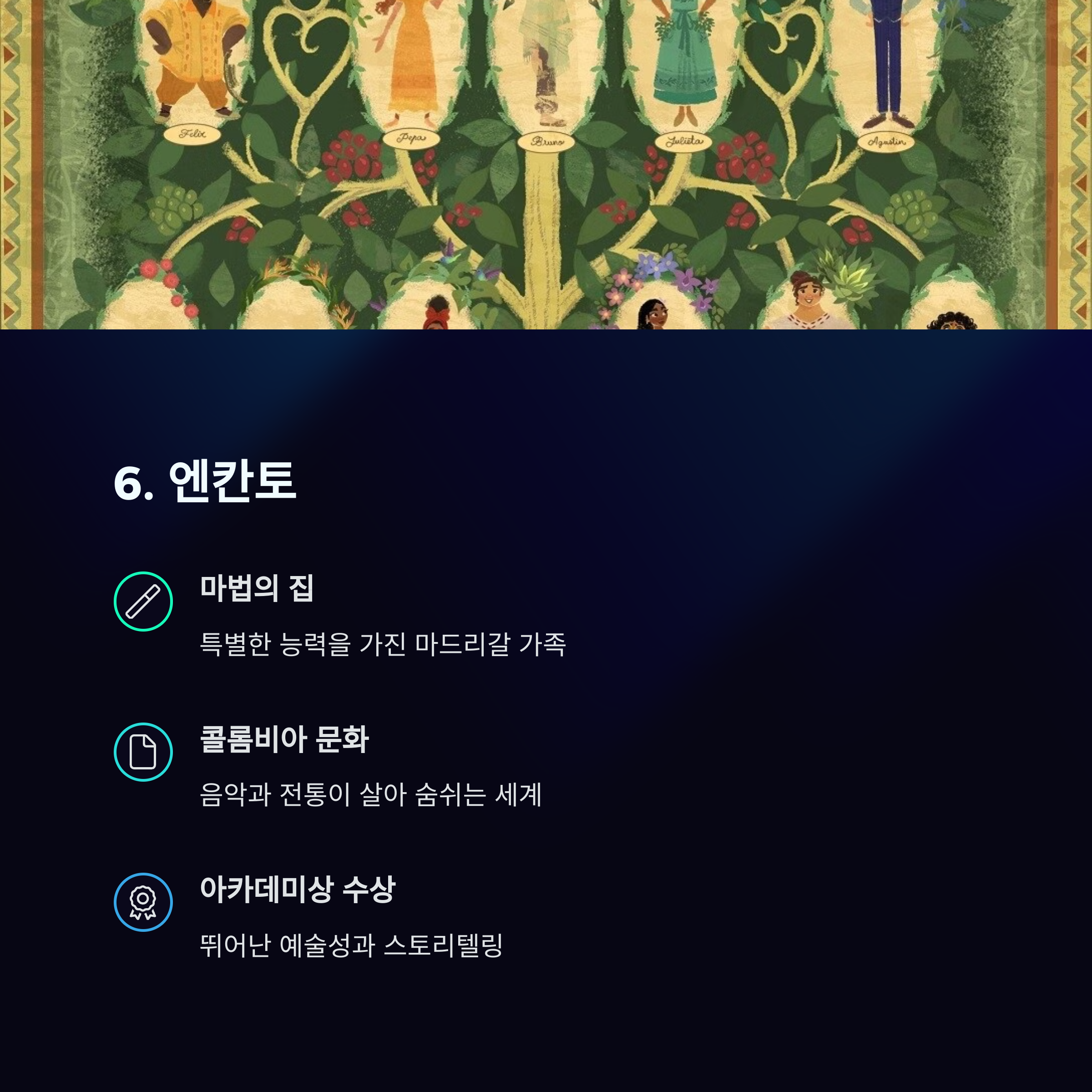 콜롬비아의 마법이 깃든 마을을 배경으로 한 이 영화는 특별한 능력을 가진 가족의 이야기를 그립니다. 주인공 미라벨은 가족의 위기를 극복하기 위해 자신의 역할을 찾아 나서며, 가족의 사랑과 화합의 중요성을 강조합니다. 화려한 색감과 감동적인 음악이 돋보이는 작품입니다.
