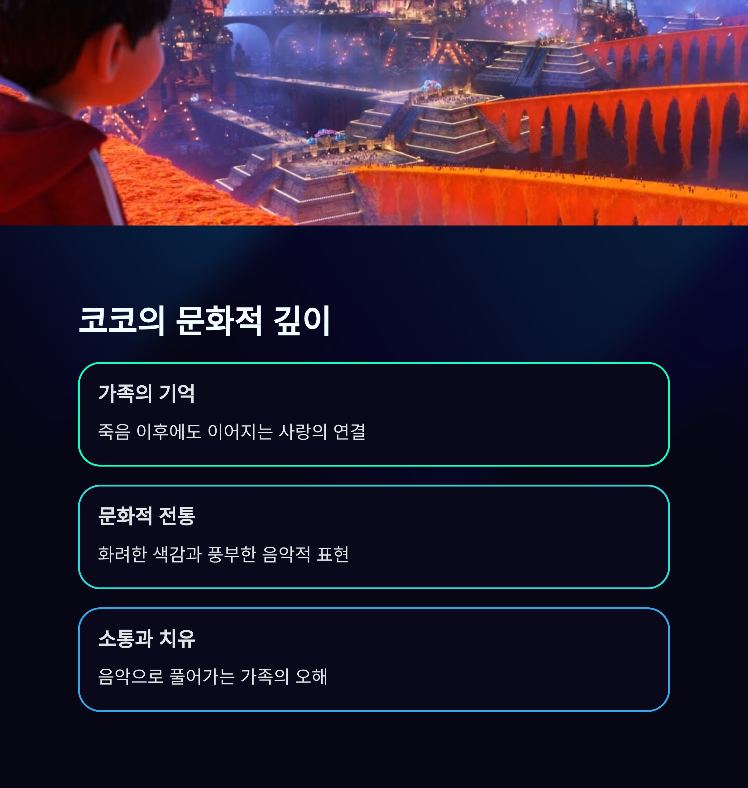 멕시코의 '죽은 자의 날'을 배경으로 한 이 영화는 음악가를 꿈꾸는 소년 미구엘이 저승으로 가는 모험을 그립니다. 미구엘은 가족의 역사와 전통을 배우며, 가족의 사랑과 기억의 소중함을 깨닫습니다. 감동적인 이야기와 아름다운 음악이 어우러져 깊은 여운을 남깁니다.