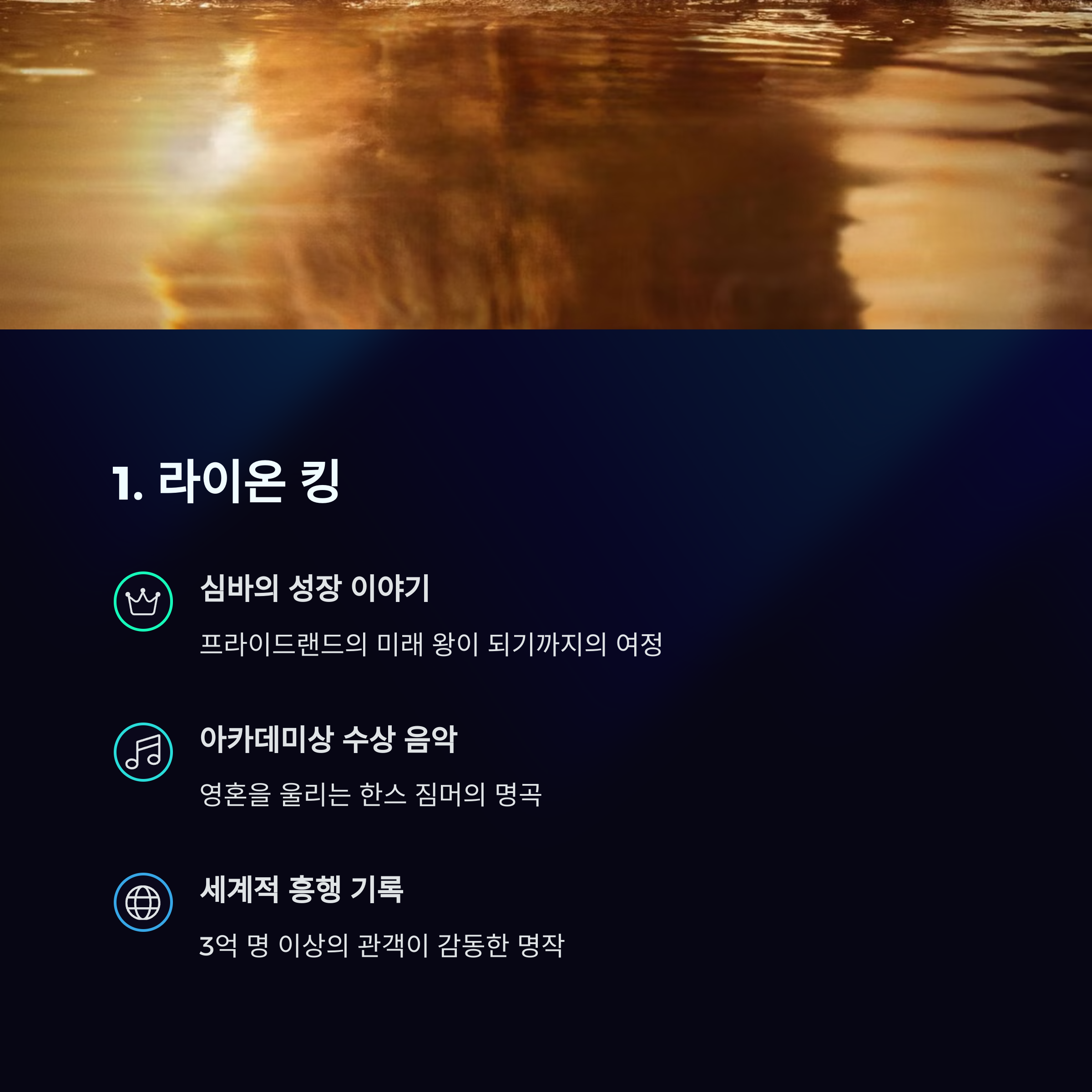 아프리카 사바나를 배경으로 한 이 영화는 어린 사자 심바가 아버지 무파사의 죽음 후 왕위를 되찾기 위해 성장하는 여정을 그립니다. 심바는 친구들과 함께 힘든 시련을 극복하며 진정한 왕으로 거듭납니다. 아름다운 애니메이션과 감동적인 음악, 그리고 용기와 책임감의 메시지가 가족 모두에게 큰 울림을 줍니다.