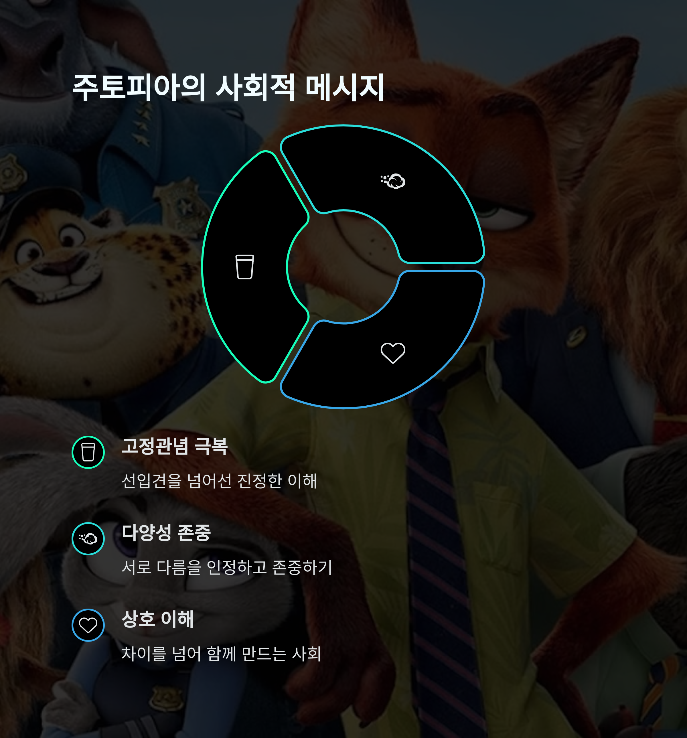 동물들이 인간처럼 살아가는 도시 주토피아를 배경으로 한 이 영화는 토끼 경찰 주디와 사기꾼 여우 닉이 함께 사건을 해결하는 이야기를 담고 있습니다. 편견과 차별을 극복하고 협력하는 모습을 통해 사회적 메시지를 전달하며, 유쾌한 코미디와 감동이 어우러진 작품입니다.