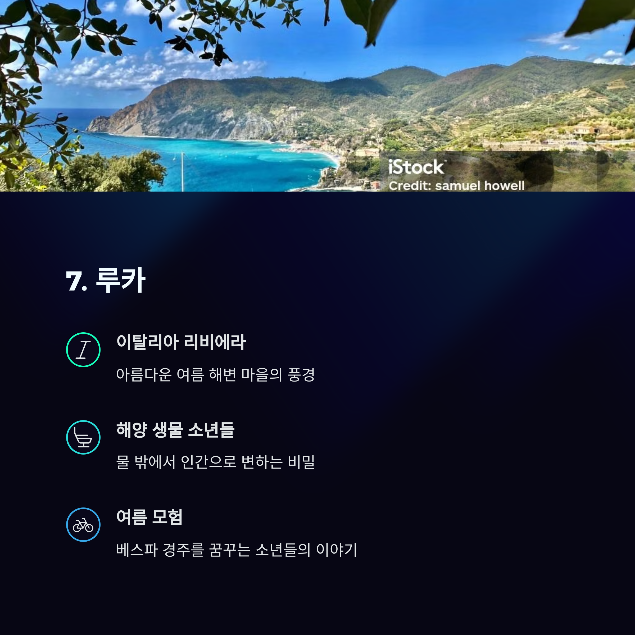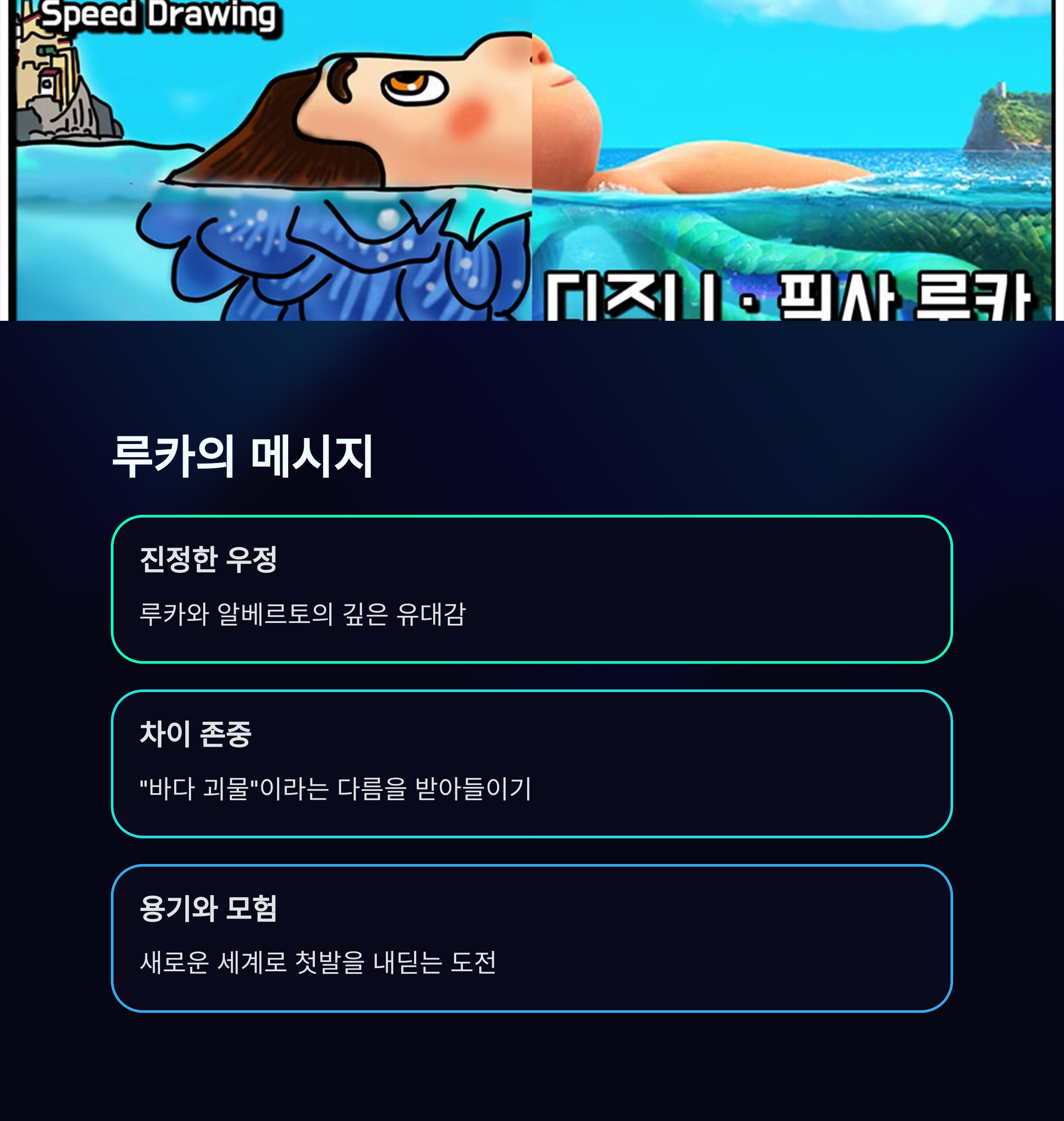 이탈리아 리비에라를 배경으로 한 이 영화는 바다 괴물 소년 루카가 인간 세상을 경험하며 성장하는 이야기를 담고 있습니다. 친구들과의 우정과 모험을 통해 자신을 발견하고, 차이와 다양성을 받아들이는 법을 배웁니다. 따뜻한 메시지와 아름다운 배경이 인상적입니다.