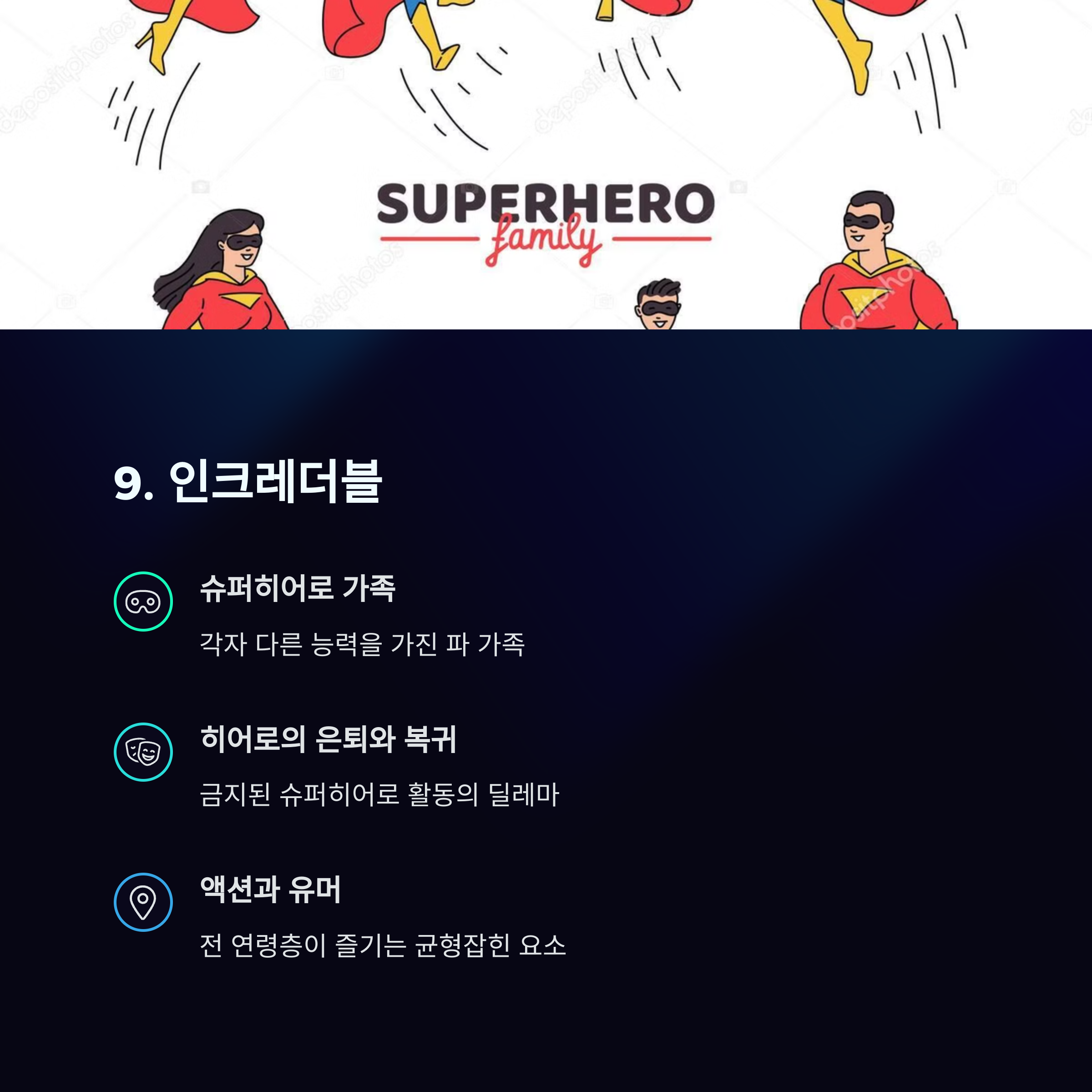 슈퍼히어로 가족의 이야기를 그린 이 영화는 은퇴한 슈퍼히어로 밥이 다시 악당과 맞서 싸우는 여정을 담고 있습니다. 가족 구성원들이 각자의 능력을 발휘해 협력하는 모습은 가족의 힘과 연대의 중요성을 강조합니다. 액션과 유머가 어우러진 흥미진진한 작품입니다.