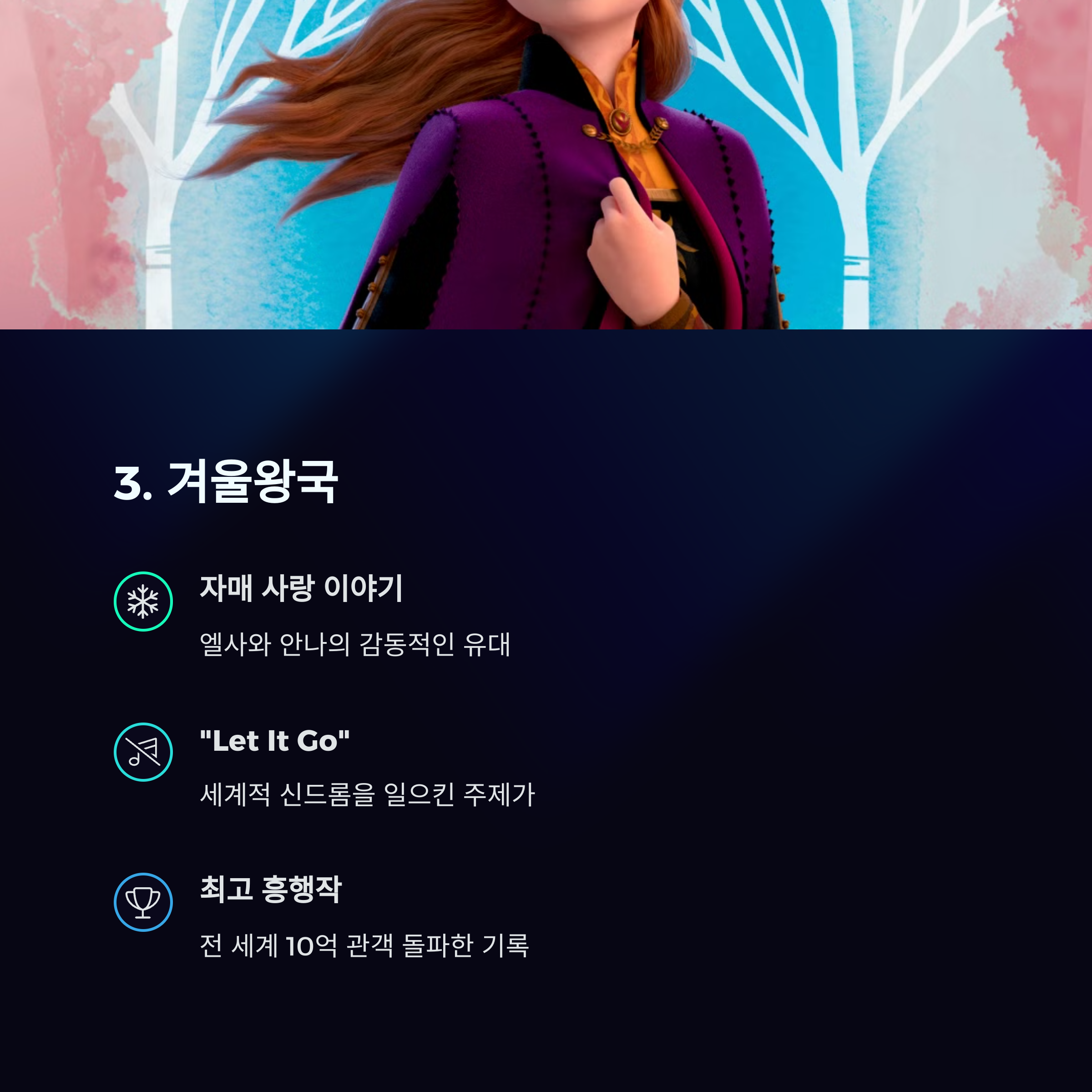 엘사와 안나 자매의 이야기를 그린 이 영화는 엘사의 마법으로 인해 얼어붙은 왕국을 구하기 위한 여정을 담고 있습니다. 자매의 사랑과 희생, 그리고 용기를 통해 가족의 소중함을 일깨워줍니다. 아름다운 음악과 화려한 애니메이션은 모든 연령층을 매료시킵니다.