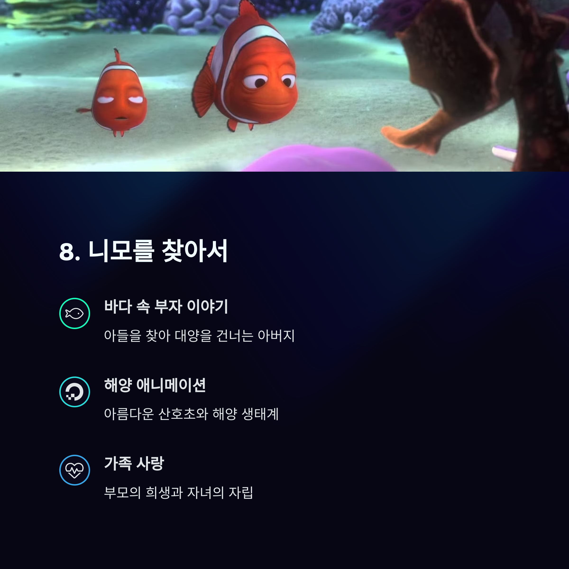 호주 대보초를 배경으로 한 이 영화는 아들 니모를 잃어버린 아버지 말린이 니모를 찾아 나서는 여정을 그립니다. 말린은 다양한 바다 생물들과의 만남을 통해 용기와 사랑의 힘을 배우며, 가족의 소중함을 일깨워줍니다. 감동과 유머가 가득한 모험 이야기입니다.