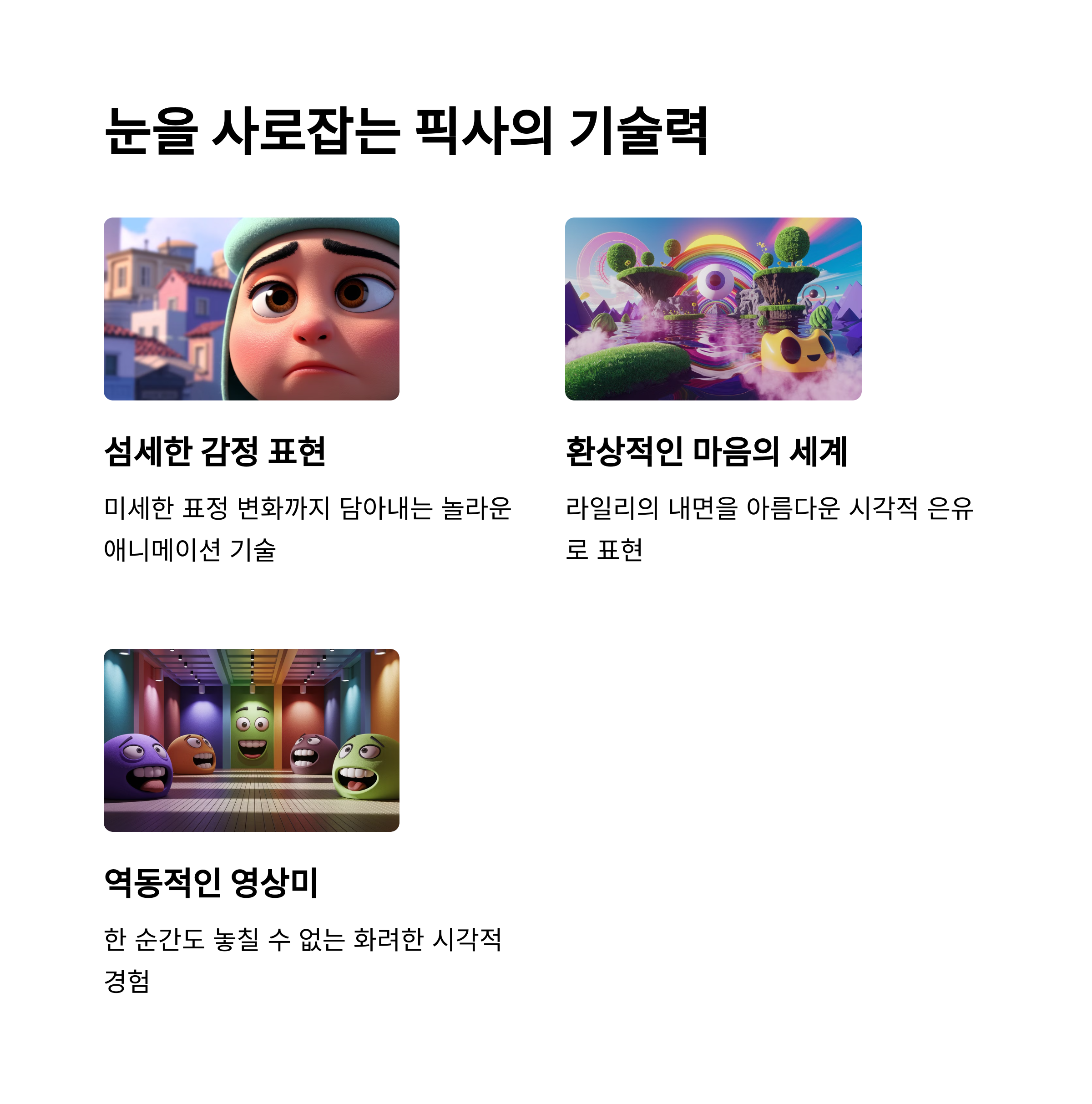 픽사는 이번 작품에서도 기대를 저버리지 않고 시각적으로 탁월한 완성도를 보여주었습니다. 특히 캐릭터의 미묘한 표정과 감정 변화는 "픽사가 또 한 번 기술력의 한계를 돌파했다"는 찬사를 받을 만큼 디테일했습니다. 영화관에서 이 작품을 보는 동안 마치 라일리의 내면을 여행하는 듯한 기분이 들었을 정도죠.