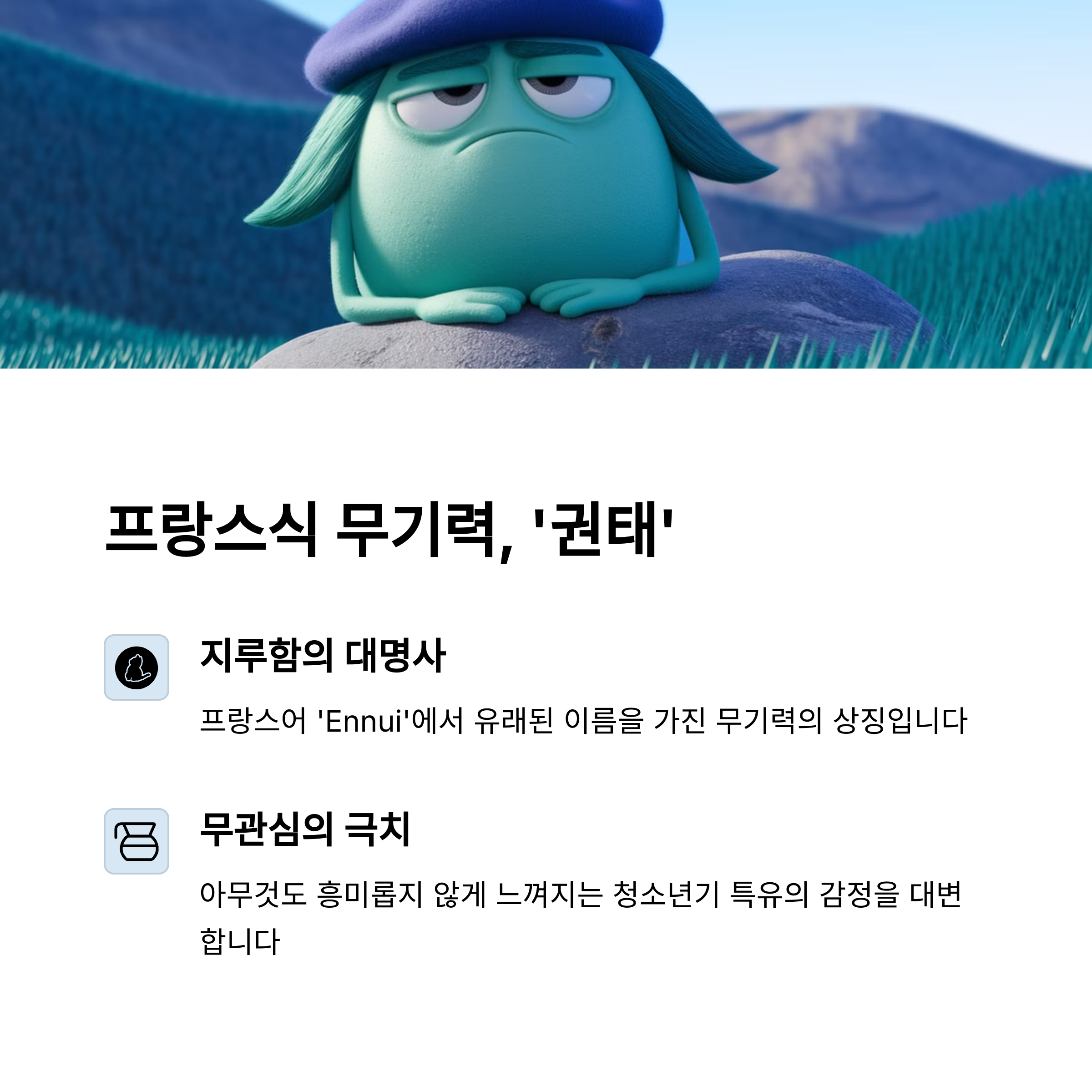 라일리의 감정 본부에는 전작의 친숙한 얼굴인 기쁨, 슬픔, 두려움, 분노, 혐오 외에 새롭게 등장한 4명의 독특한 감정 캐릭터들이 활약합니다. 바로 불안(Anxiety), 부끄러움(Embarrassment), 질투(Envy), 권태(Ennui)인데요, 이들은 사춘기라는 복잡한 시기에 흔히 느끼는 감정을 섬세하고도 위트 있게 표현하며 극의 재미와 깊이를 더했습니다.