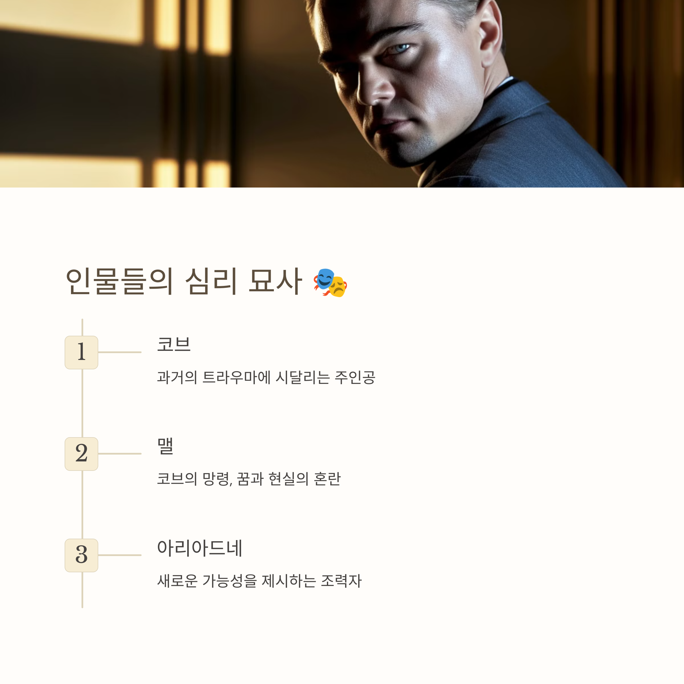 도미닉 코브(레오나르도 디카프리오): 꿈속에서 정보를 훔치는 최고의 전문가이지만, 아내의 죽음 이후 현실과 꿈의 경계가 모호해진다.