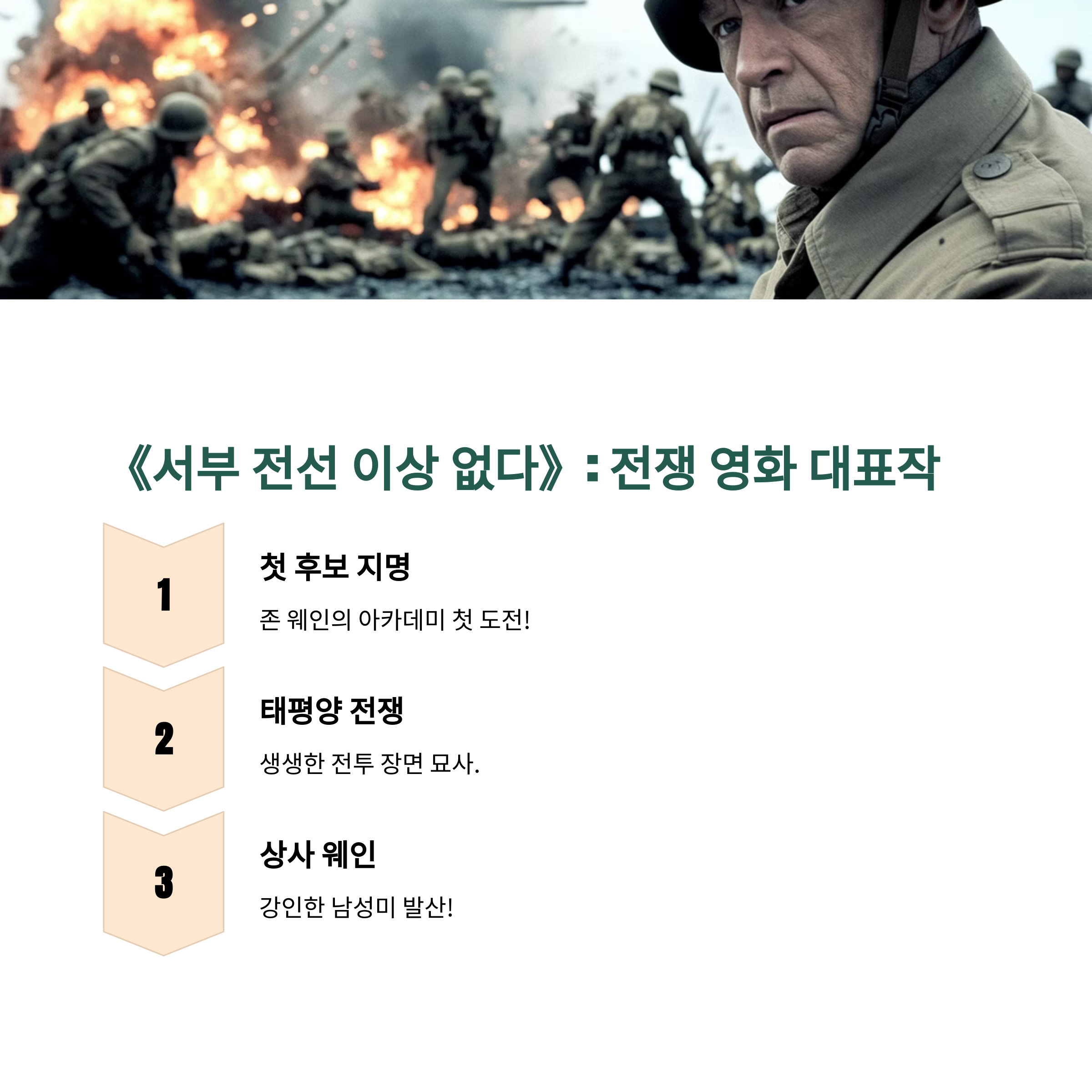 존 웨인은 서부극뿐만 아니라 전쟁 영화에서도 독보적인 연기를 펼쳤다. 그중 대표작이 "서부 전선 이상 없다"다.
