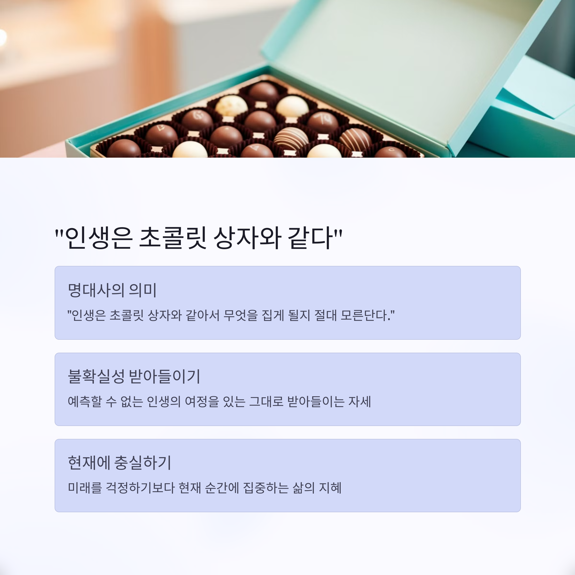 영화 속 포레스트의 엄마가 남긴 "인생은 초콜릿 상자와 같아. 절대 어떤 초콜릿을 고를지 모른단다"라는 명언은 우리 삶의 불확실성과 그 안에 숨겨진 아름다움을 동시에 표현합니다.