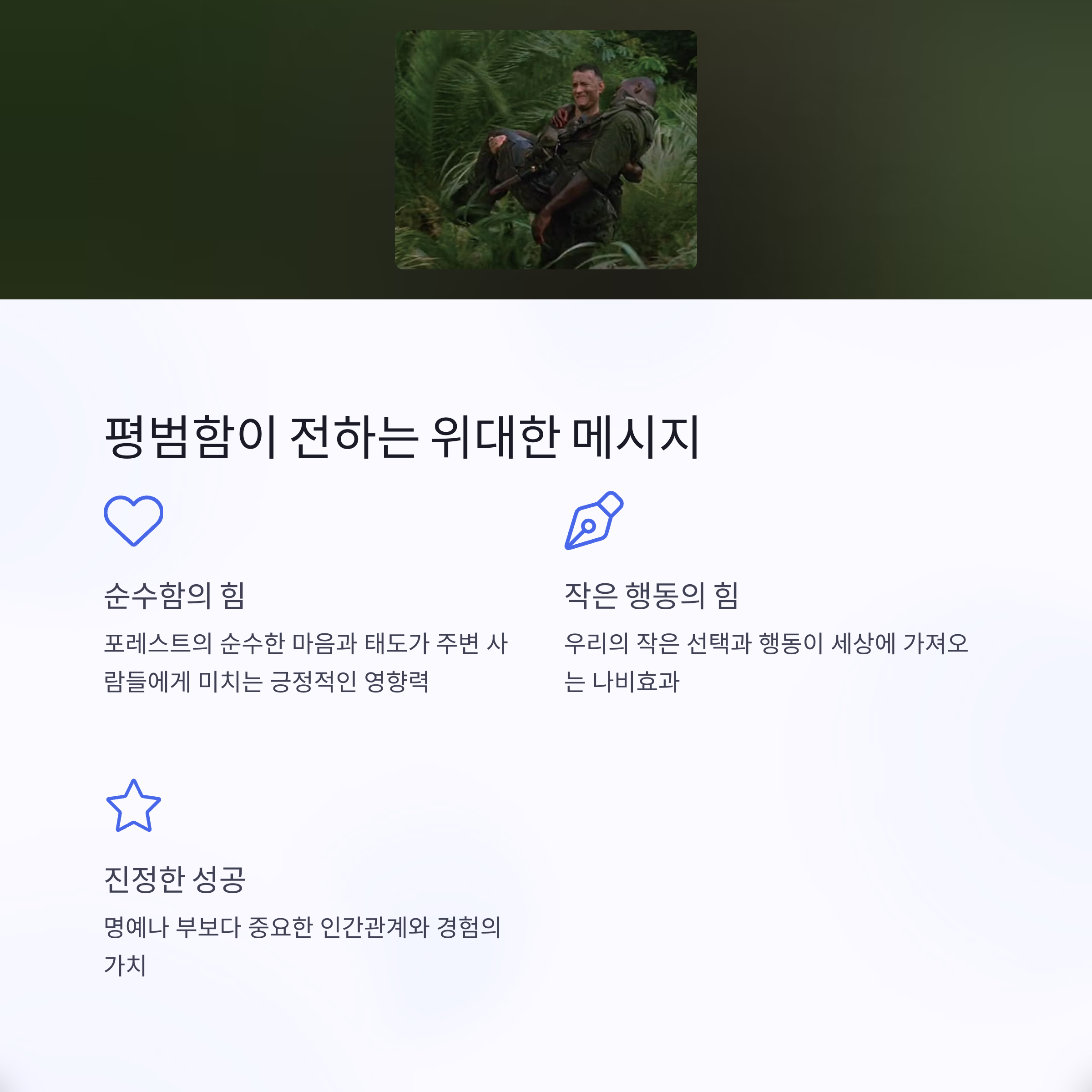 포레스트는 지적 능력은 부족했지만, "금상첨화"라는 표현처럼 순수한 마음과 타인을 향한 무조건적 사랑으로 자신의 삶을 완성해 나갔습니다. 그는 복잡한 세상에서도 단순함을 잃지 않고 자신의 가치를 지켜나갔습니다.