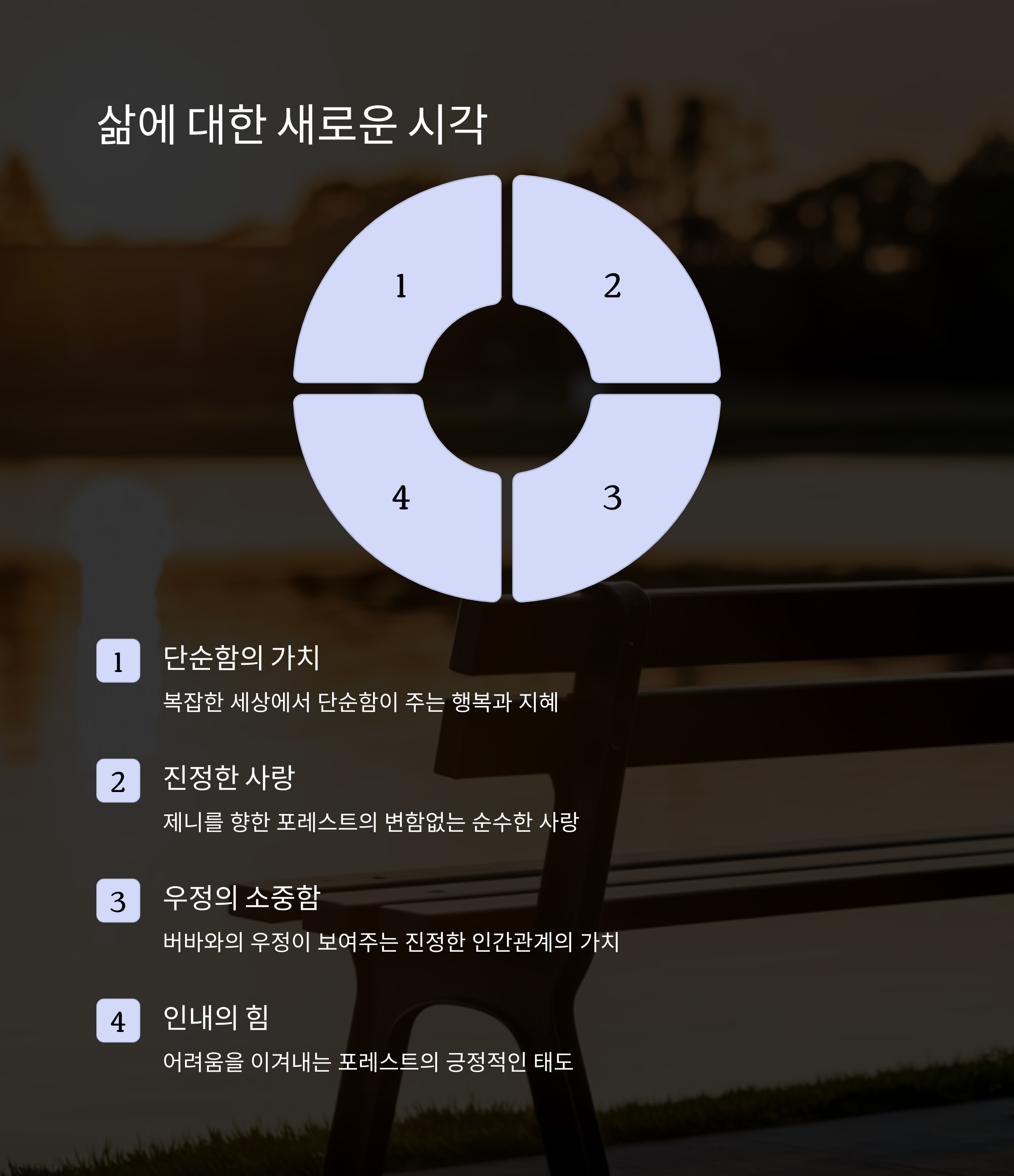 "사공이 많으면 배가 산으로 간다"는 속담처럼, 때로는 다양한 의견과 기준에 휘둘리기보다 자신만의 단순하고 확고한 원칙을 따라가는 것이 더 현명할 수 있습니다. 포레스트 검프는 그런 단순함의 지혜를 우리에게 가르쳐 주는 스승과 같은 작품입니다.