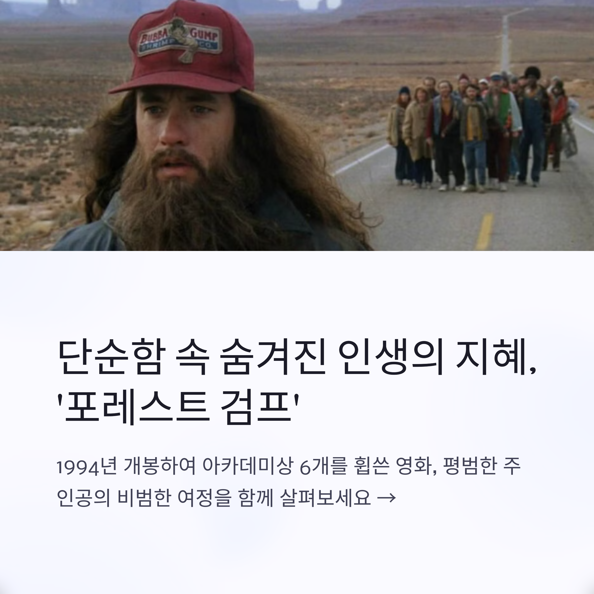 대학교 3학년, 진로에 대한 고민으로 밤잠을 설치던 시절에 우연히 케이블 TV에서 '포레스트 검프'를 보게 되었습니다. "걱정 반, 근심 반"으로 가득 찬 마음으로 시작한 영화였지만, 끝날 무렵엔 마음이 이상하게 가벼워졌습니다.