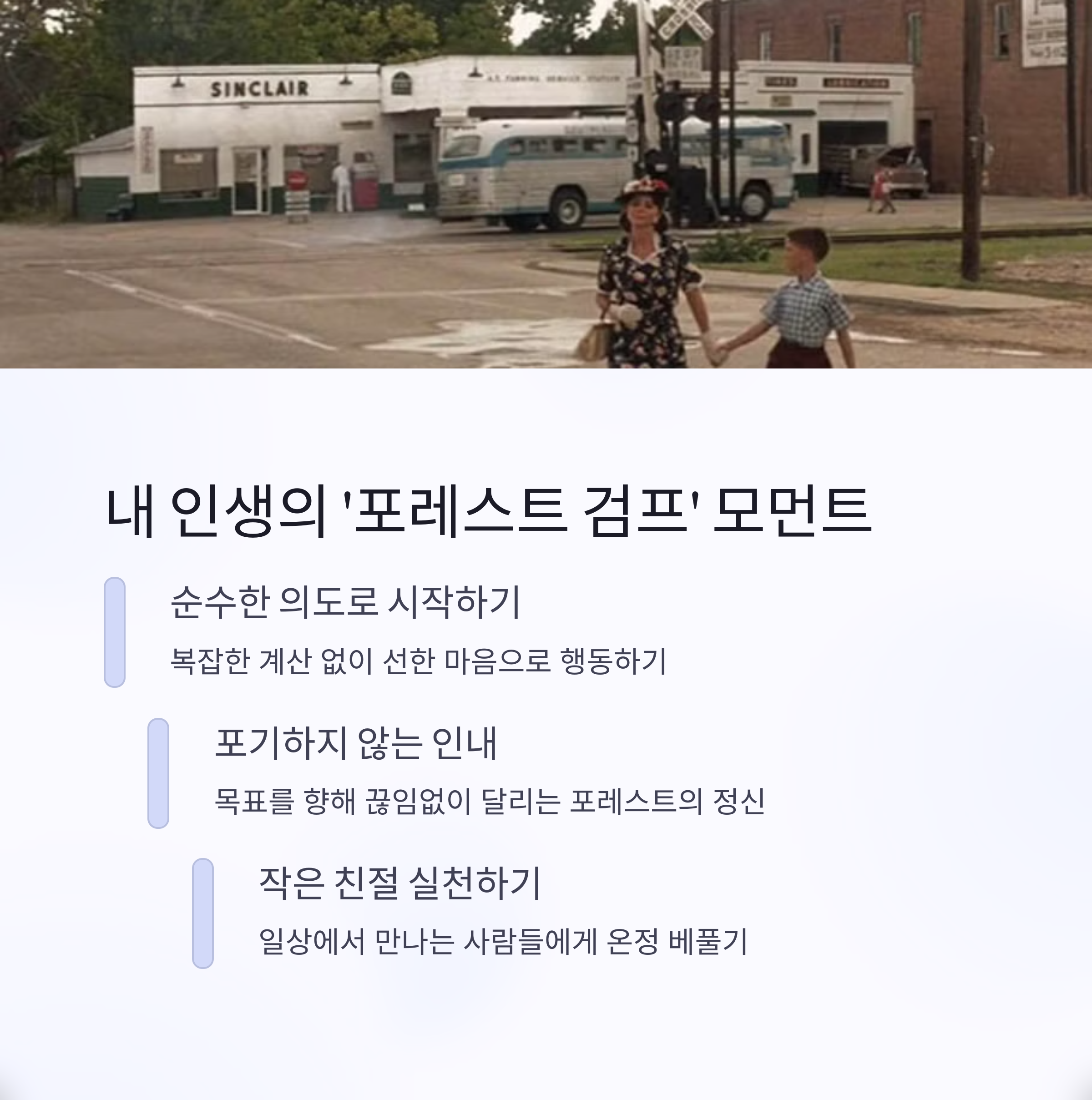 "사공이 많으면 배가 산으로 간다"는 속담처럼, 때로는 다양한 의견과 기준에 휘둘리기보다 자신만의 단순하고 확고한 원칙을 따라가는 것이 더 현명할 수 있습니다. 포레스트 검프는 그런 단순함의 지혜를 우리에게 가르쳐 주는 스승과 같은 작품입니다.