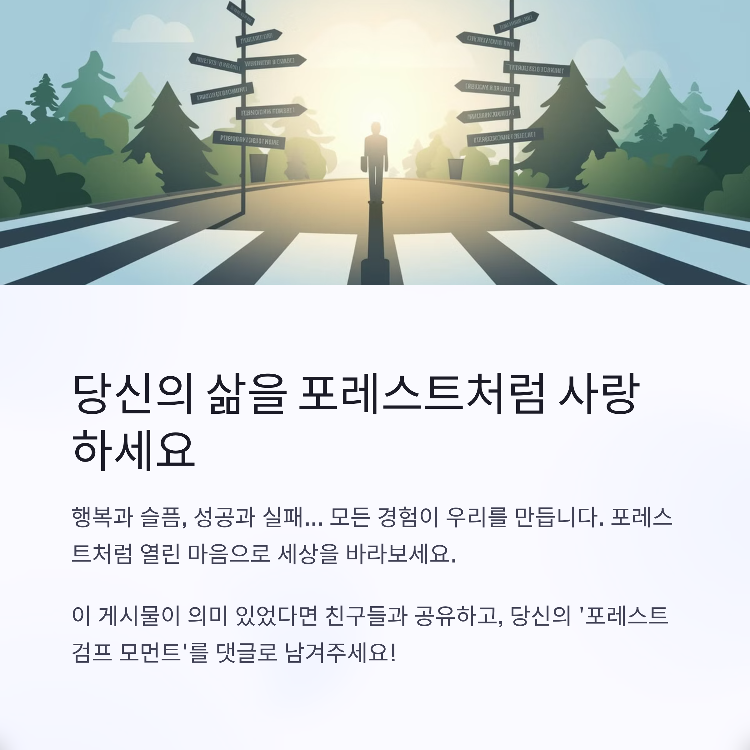 인생은 때로 복잡하고 예측불가능합니다. 하지만 포레스트처럼 순수한 마음으로 한 걸음씩 나아간다면, 어쩌면 우리도 그만의 특별한 여정을 완성할 수 있지 않을까요? 벤치에 앉아 낯선 이에게 자신의 이야기를 들려주던 그의 모습처럼, 언젠가 우리도 누군가에게 들려줄 아름다운 이야기를 만들어 나가길 바랍니다.