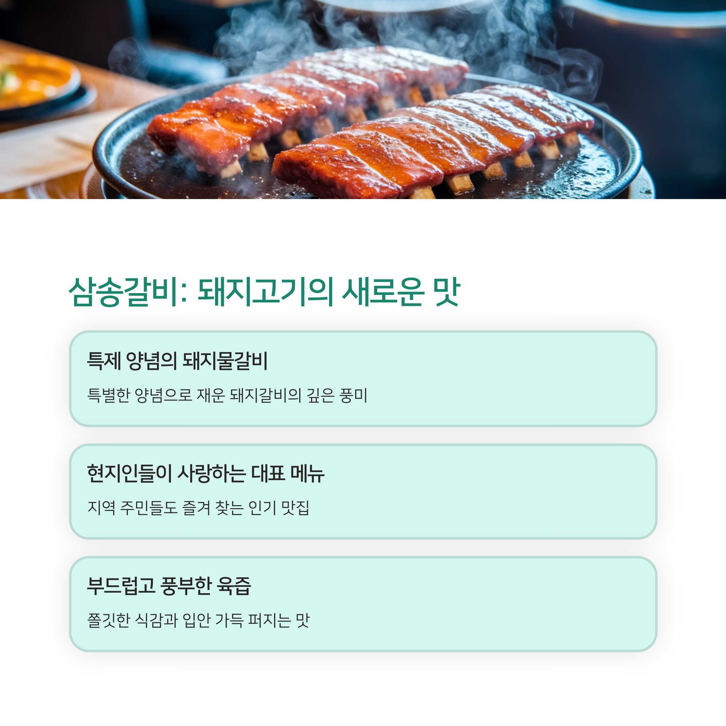 마지막으로 ‘삼송갈비’의 돼지물갈비를 소개할게요. “해산물 덕후인데 돼지고기?”라고 의아해할 수도 있지만, 이건 동해 스타일이에요. 돼지갈비를 물회처럼 차가운 육수에 담가 먹는 독특한 요리로, 여기에 오징어와 해삼을 추가하면 해산물 풍미가 더해져요. 처음 맛봤을 때, “이건 혁신이야!”라며 감탄했죠.