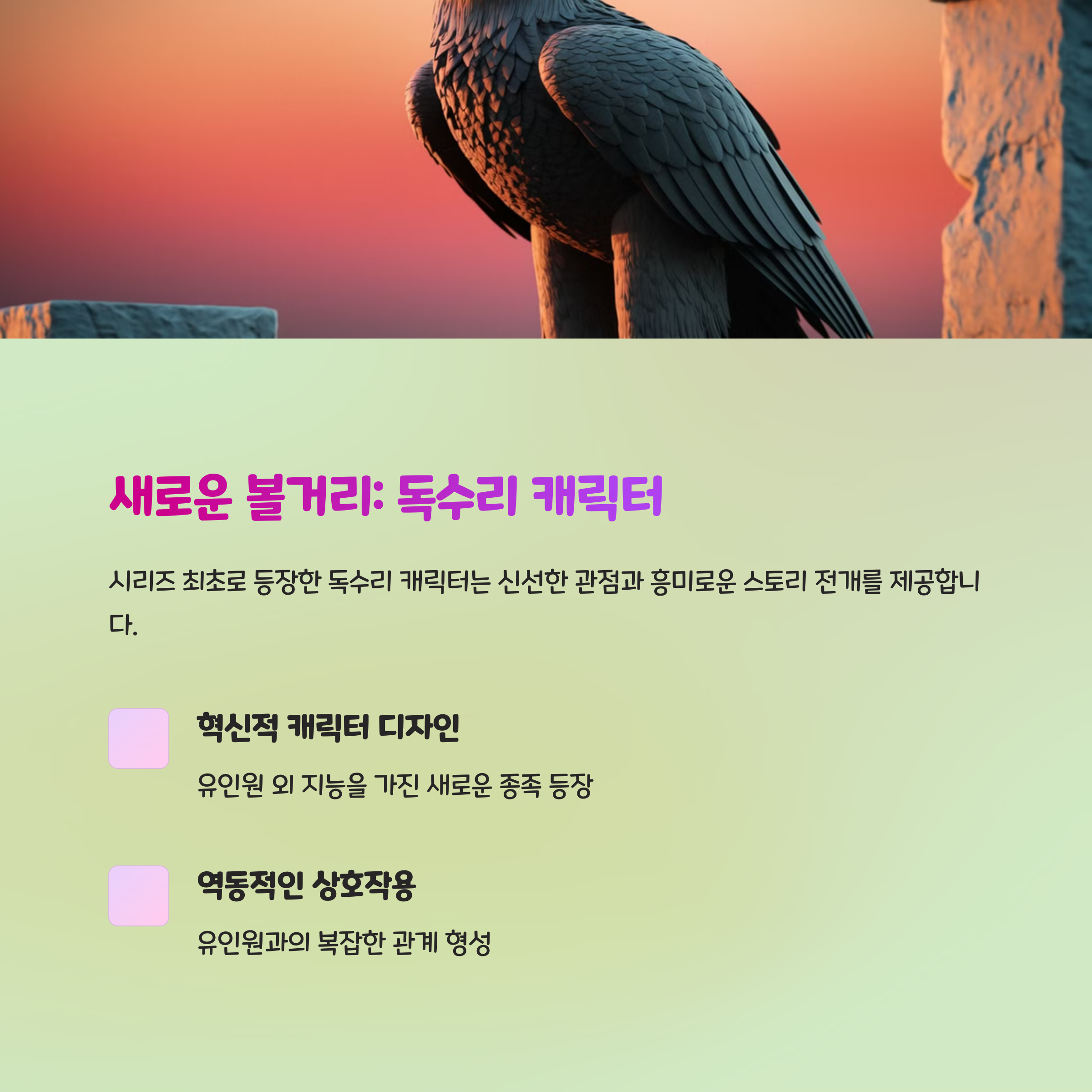 특히나 이번 영화는 "새 술은 새 부대에 담아라"는 속담처럼 독수리라는 새로운 캐릭터를 등장시키며 세계관에 신선한 활력을 불어넣었습니다.