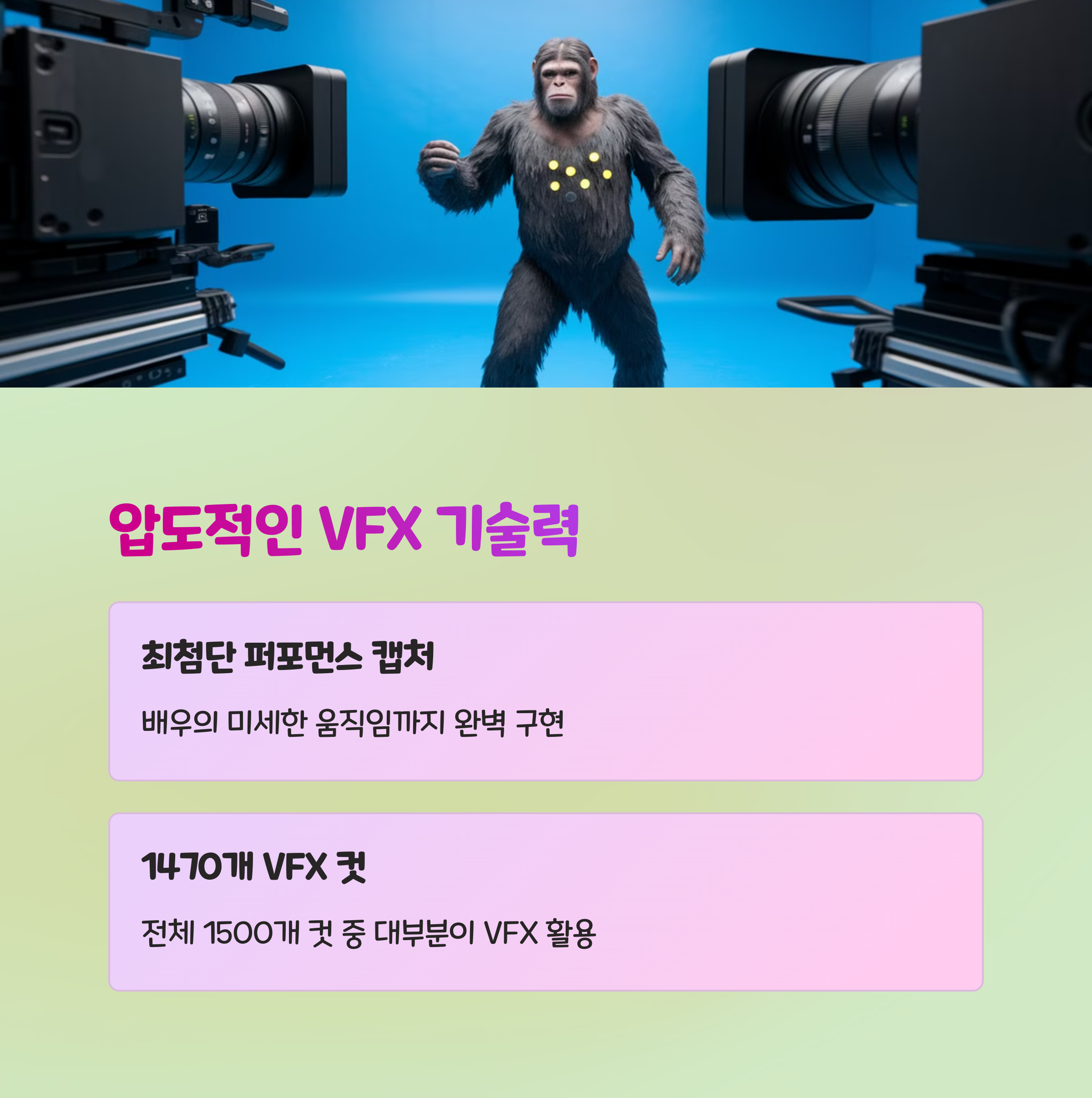 특히 영화의 러닝타임 144분 동안 보여준 VFX 기술력은 영화 속 세계를 마치 직접 체험하듯 생생하게 만들었습니다. 일부 관객은 "유인원의 미세한 표정 변화까지 표현한 기술력이 정말 놀랍다!"고 극찬하며 디지털 기술의 한계를 뛰어넘었다고 평가했습니다.