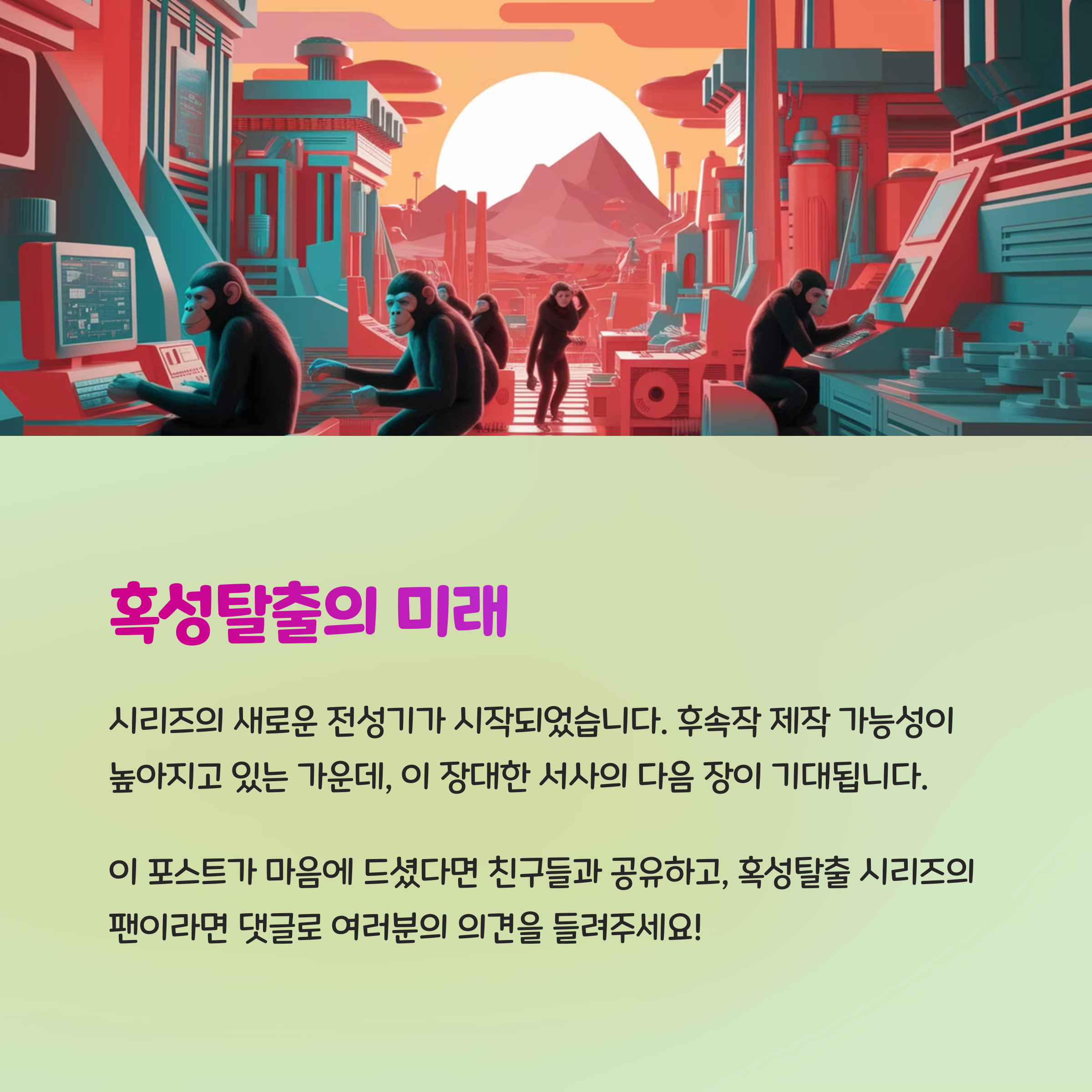 "강한 자가 살아남는 것이 아니라 살아남은 자가 강한 것이다." 영화 속 시저의 명대사처럼, 새로운 시대를 맞이한 이번 작품은 어떤 어려움과 변화 속에서도 결국 중요한 것은 살아남아 미래를 향해 나아가는 것임을 잘 보여줍니다. 유인원과 인간, 서로 다른 두 종족의 갈등과 화합을 통해 우리는 과연 무엇이 진정한 문명인지 생각해보게 됩니다.