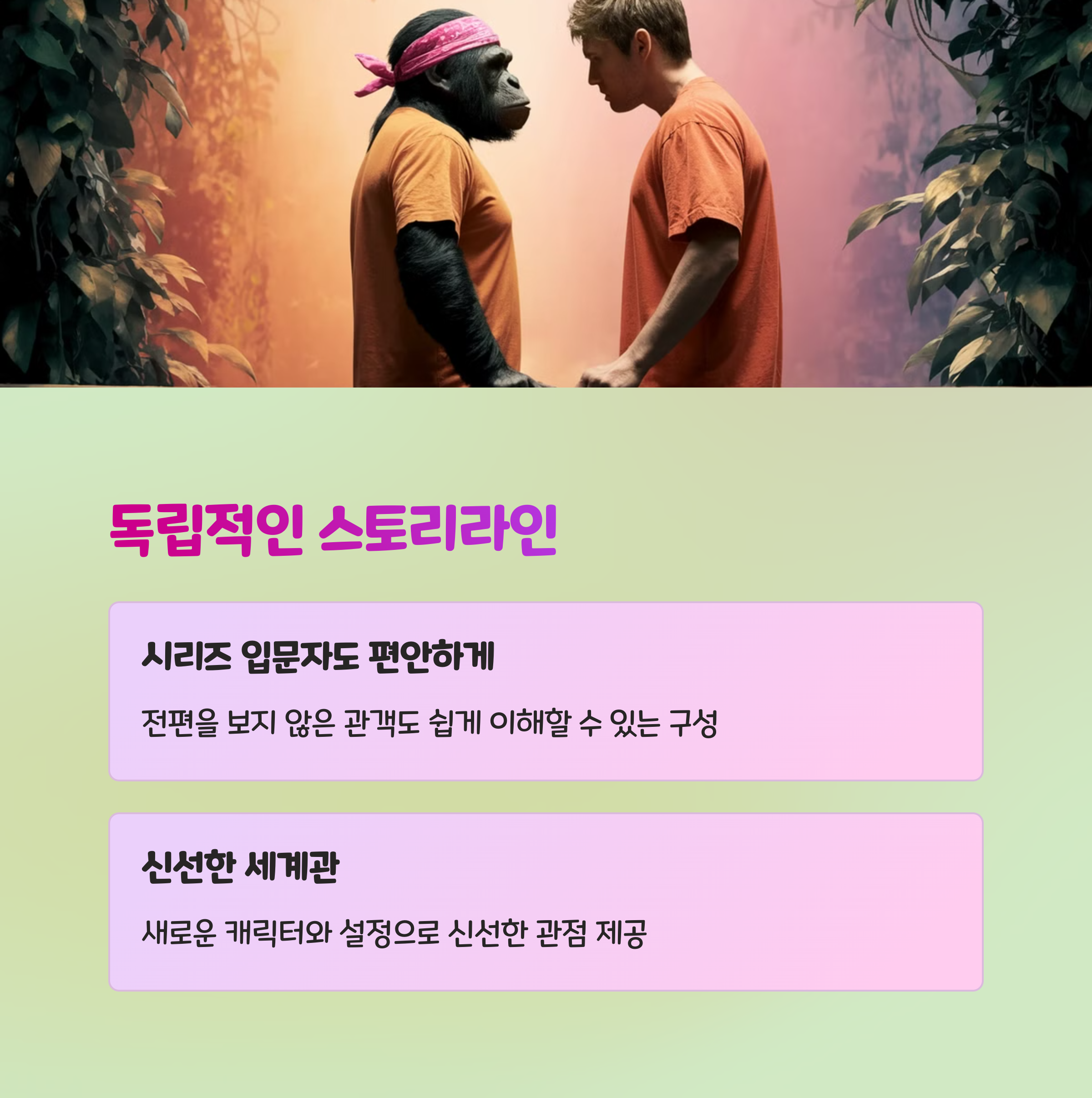 한 가지 재밌는 점은, 이번 작품이 리부트 시리즈의 4번째 영화지만 독립적인 스토리 라인을 채택해 "전편을 보지 않은 사람들도 무리 없이 즐길 수 있다"는 점입니다. 덕분에 주변에서 흔히 듣는 "시리즈 영화를 보려면 1편부터 정주행해야 한다"는 부담감 없이 이 영화만으로도 충분히 즐길 수 있다는 큰 장점을 갖추고 있죠.